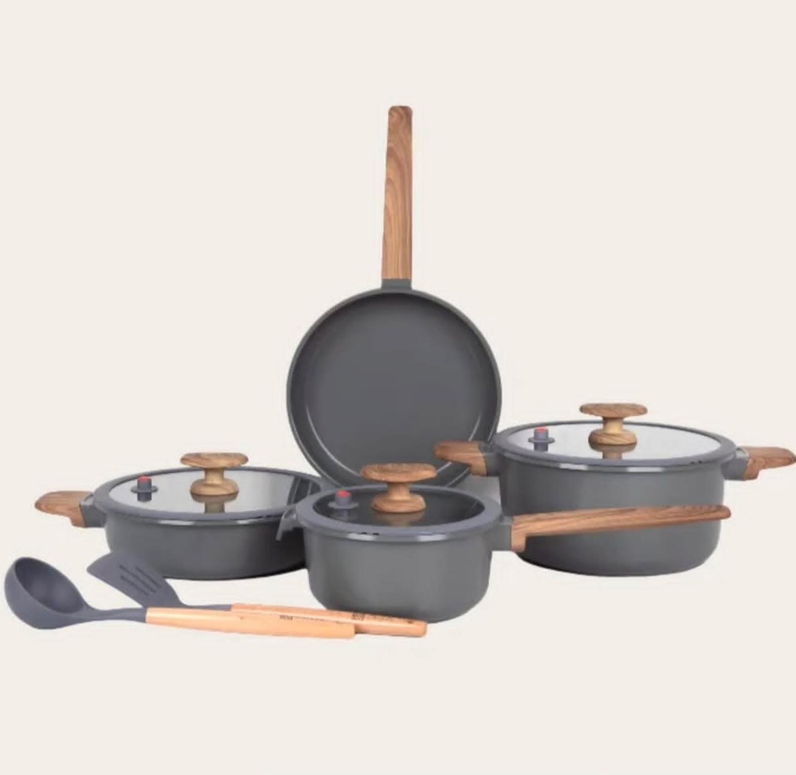 Discover superior meal preparation with the Signature 15-Piece Nonstick Die-Cast Cookware Set, a collection designed for both functionality and aesthetic appeal, available in striking multiple colors. Crafted from robust die-casting aluminum, these pieces boast a high-performance ceramic nonstick coating on both the inside and outside, ensuring comprehensive durability and easy maintenance. Health-conscious users will appreciate that the entire set is guaranteed free from harmful chemicals, including PFAS, PFOA, Lead, and Cadmium. The comprehensive 15-piece assortment covers every cooking task, featuring an 18cm Sauce Pan with Lid, a 24cm Sauce Can with Lid, a large 28cm Casserole, a handy 28cm Sauté Pan with Lid, and two versatile Frying Pans (24cm and 26cm). Furthermore, the collection includes a bonus 5-Piece Silicon Spoons with Stand set. The cookware is designed to be fully dishwasher safe, simplifying your post-meal routine, and features elegant, heat-safe wooden-style handles.