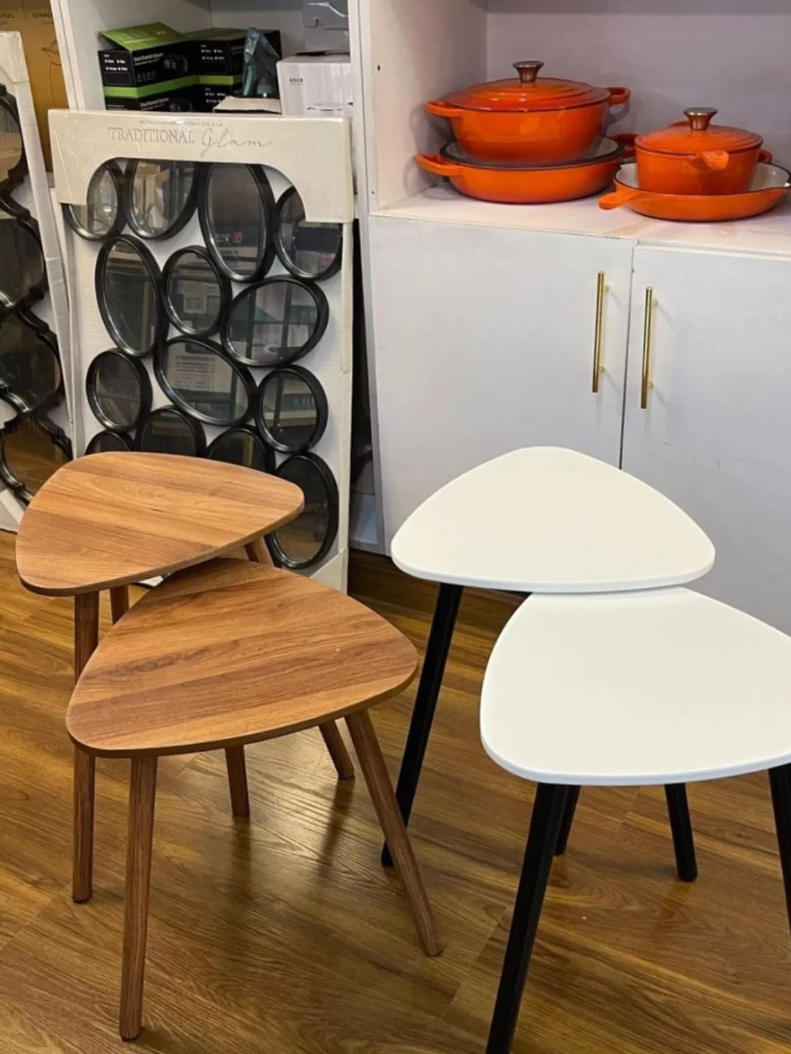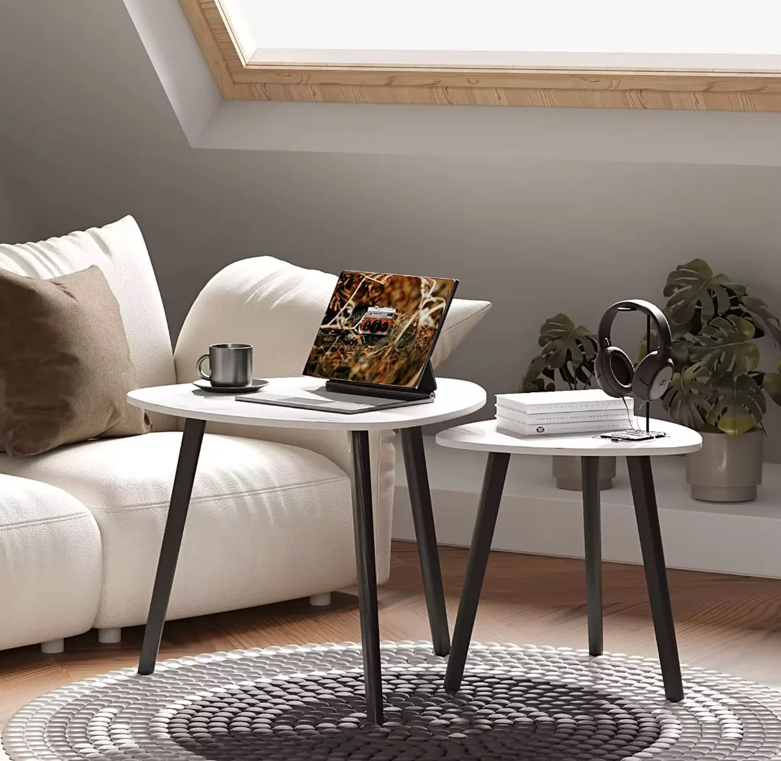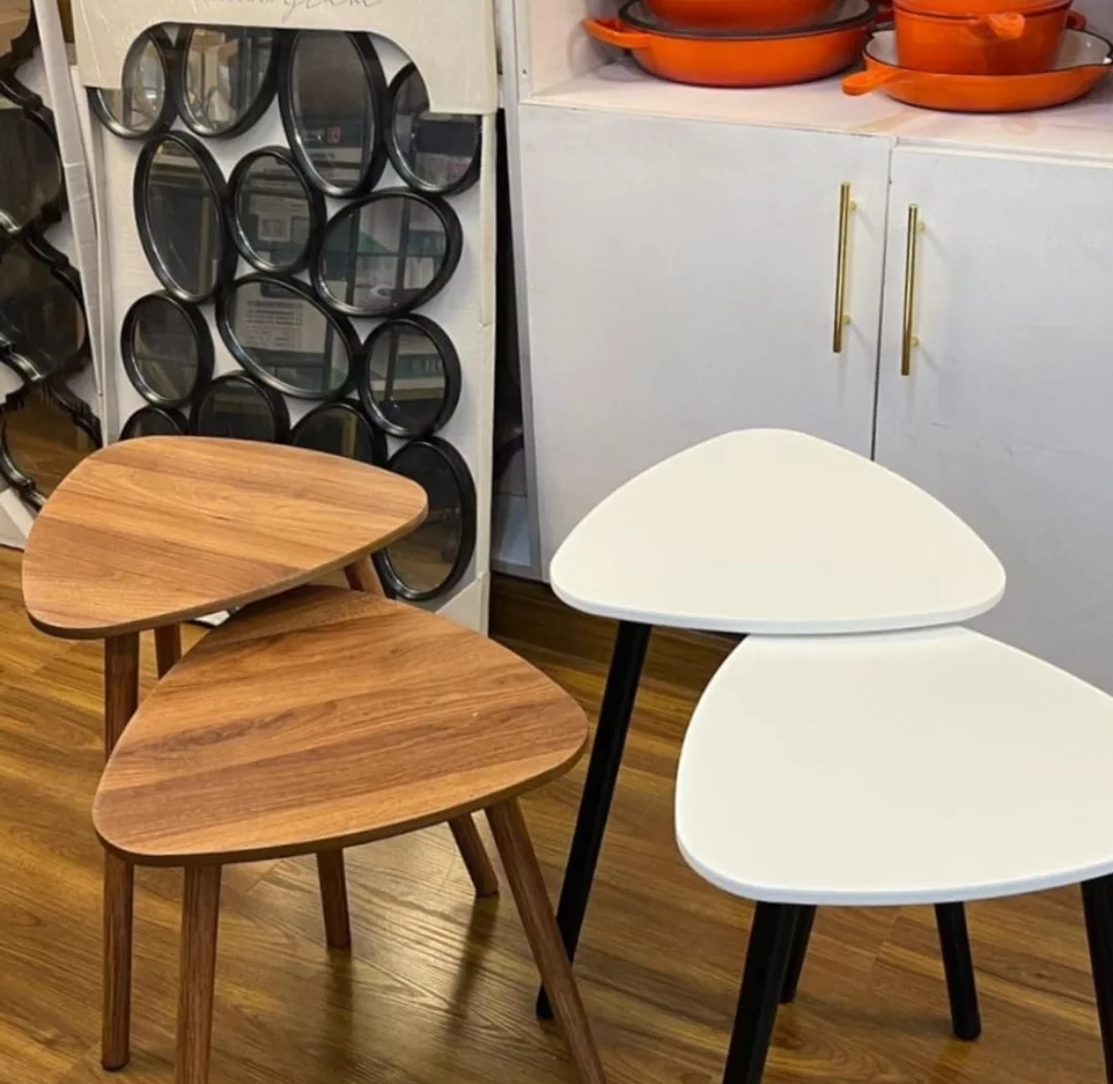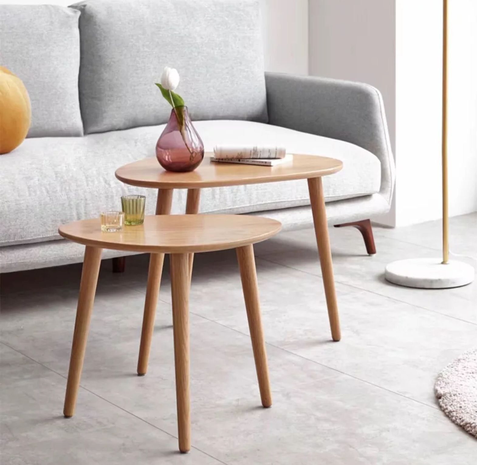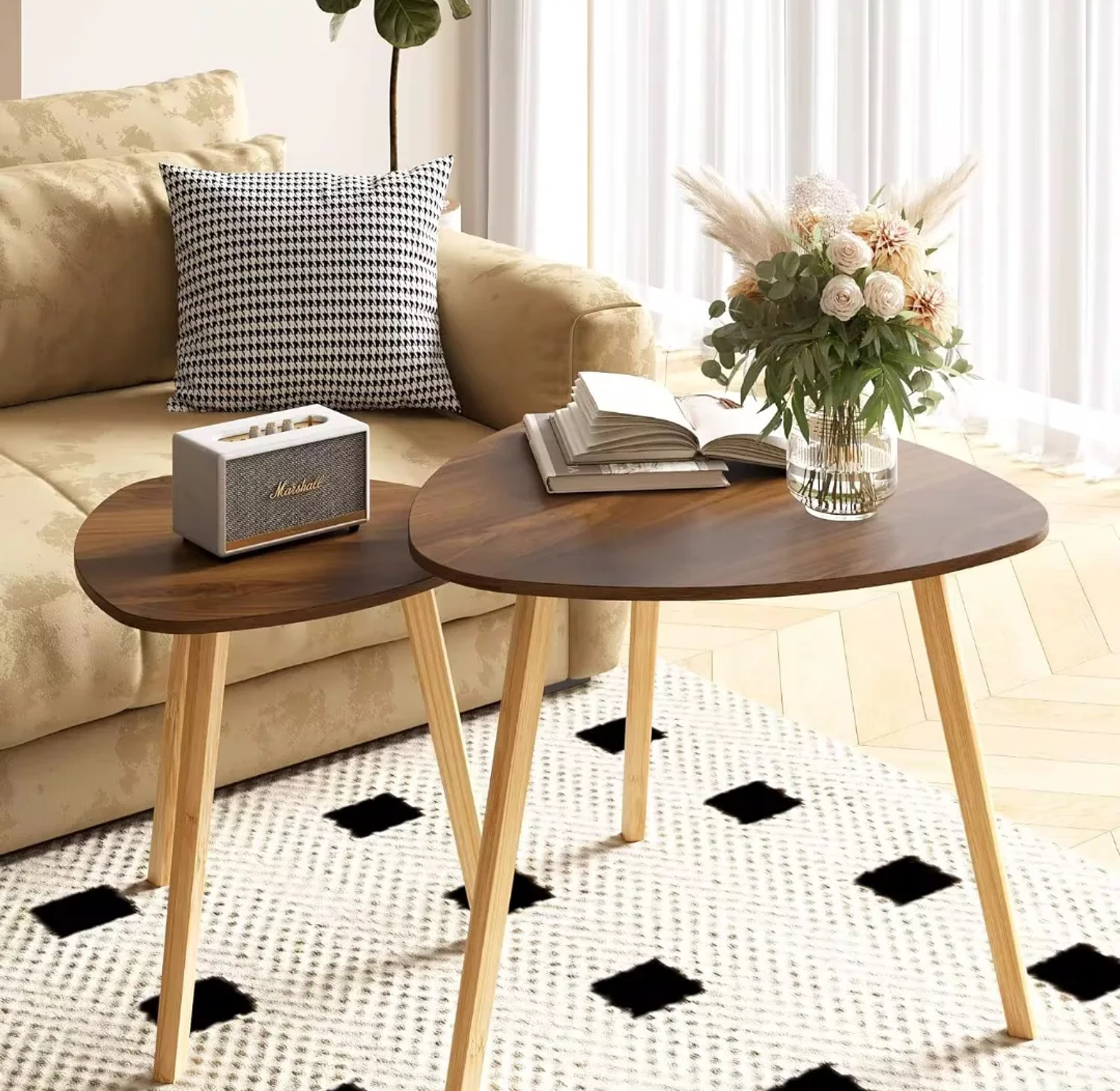 Introduce flexible and functional design to your sitting area with this attractive 2-piece nesting coffee table set. Each table is constructed from solid wood, ensuring a durable and premium quality foundation for your daily life. The set features two distinct, complementary sizes—50 cm×40 cm×40 cm and 45 cm×39 cm×38 cm—that can be used together for a tiered look, spread across a room, or nested neatly to save space when needed. The organic, slightly rounded triangular tabletop shape and clean-lined tapered legs are inspired by Mid-Century Modern aesthetics, adding a chic, natural element to your décor. Available in both rich walnut brown and light brown finishes, you can select the perfect tone to match your existing furniture and create a sophisticated, organized environment.