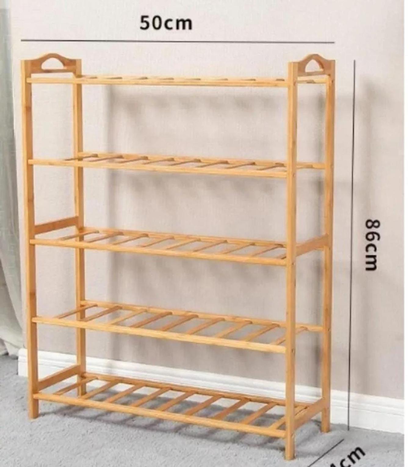 Organize your footwear neatly with this 5-layer bamboo shoe rack, crafted from durable, eco-friendly bamboo for strength and timeless appeal. Its multi-tier design provides ample space for shoes, sandals, and boots, helping you keep your entryway or closet clutter-free. The open slatted shelves allow for air circulation, keeping shoes fresh, while the smooth finish adds a warm, natural touch to your home décor. Lightweight yet sturdy, it’s easy to assemble and perfect for bedrooms, hallways, or walk-in closets.