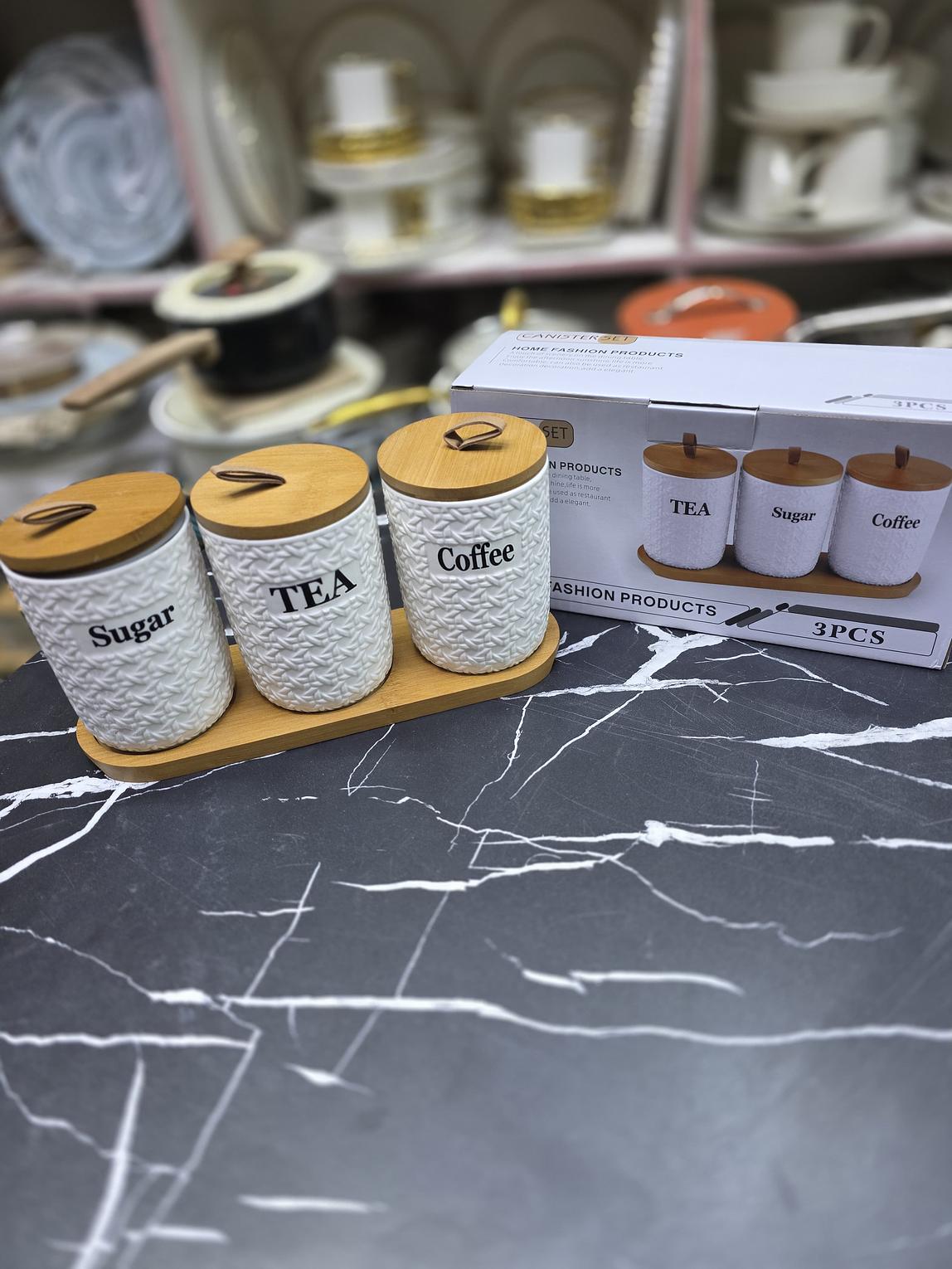 3-Piece Sugar, Tea & Coffee Canister Set – With Wooden Lids & Tray