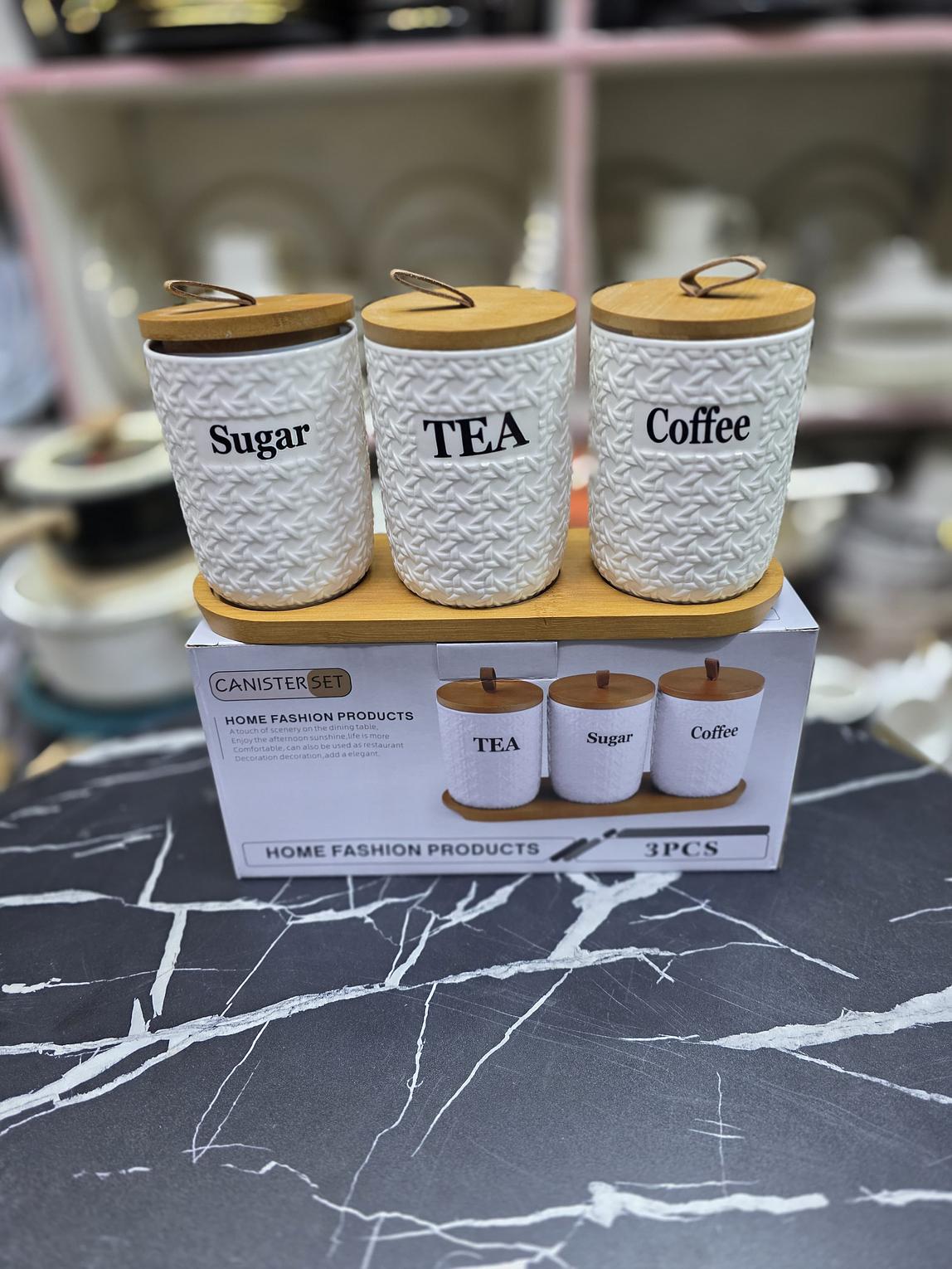 Elevate your kitchen countertop with this stylish 3-piece canister set designed for neatly storing your everyday essentials — sugar, tea, and coffee. Each jar features a beautifully textured ceramic finish paired with an airtight wooden lid to keep contents fresh and dry. The set comes complete with a matching wooden tray for easy organization and a clean, modern look.