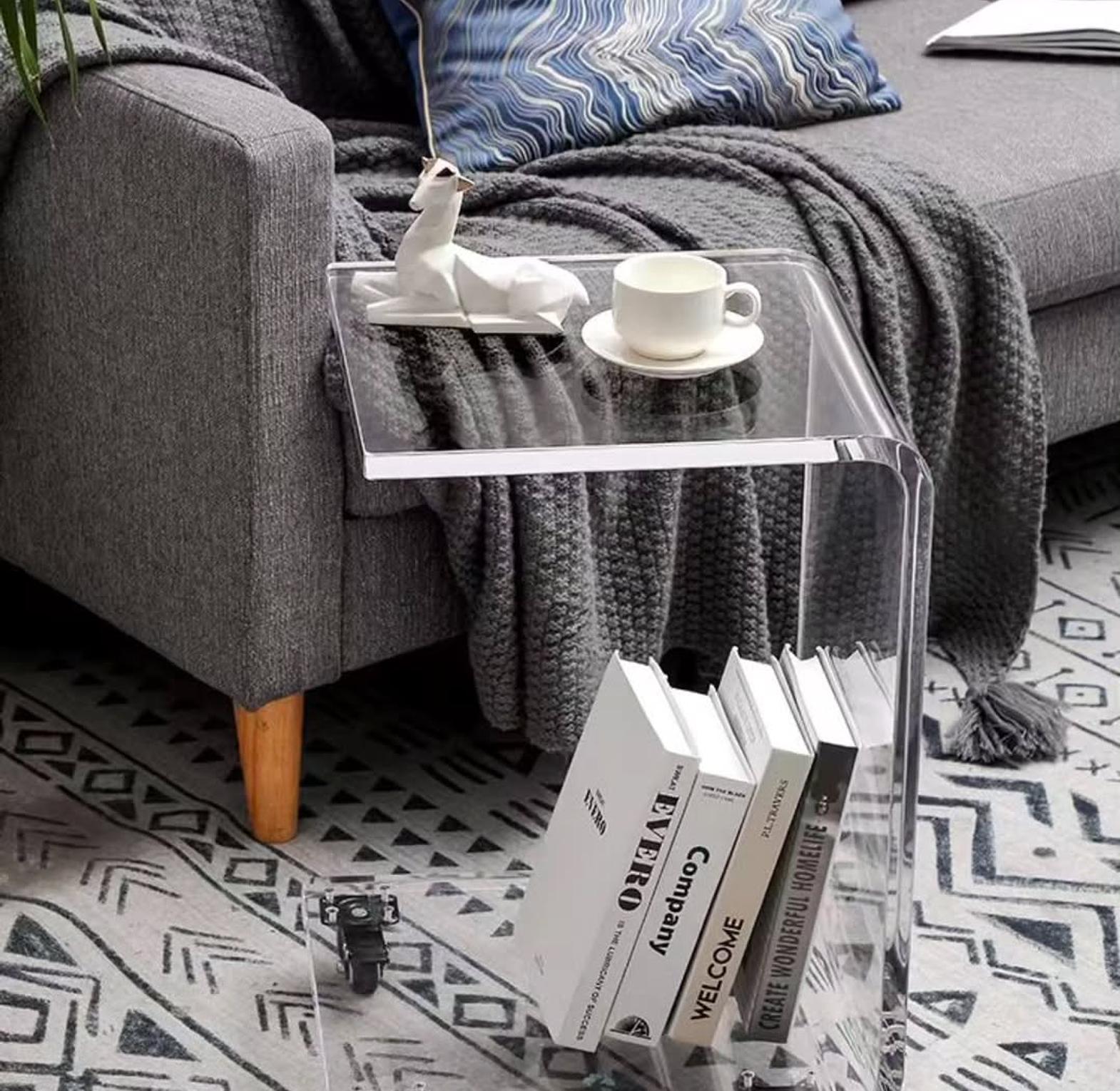 The Crispa Luxury C-Shaped Acrylic Side Table combines contemporary elegance with practical functionality, making it a must-have for modern interiors. Crafted from 18mm thick premium clear acrylic, it offers durability and a sleek, minimalist aesthetic that blends seamlessly with any décor. Its C-shaped design allows the table to slide conveniently under sofas or beds, while the integrated wheels provide effortless mobility for work, dining, or display purposes. Measuring 33x38x58cm, this lightweight yet sturdy table is perfect for holding laptops, drinks, books, or decorative items, adding both style and convenience to your living space.