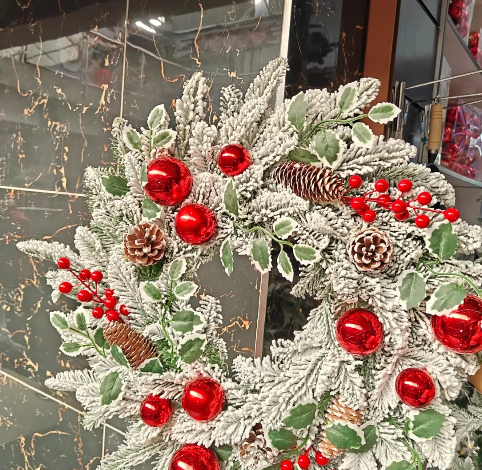 Create a magical, winter wonderland entrance with this high-quality, pre-decorated Christmas wreath. Measuring a substantial 50 cm in diameter, this wreath is built on a lush, dense spruce base that is meticulously snow-flocked to achieve a realistic, icy, and beautiful wintry look.