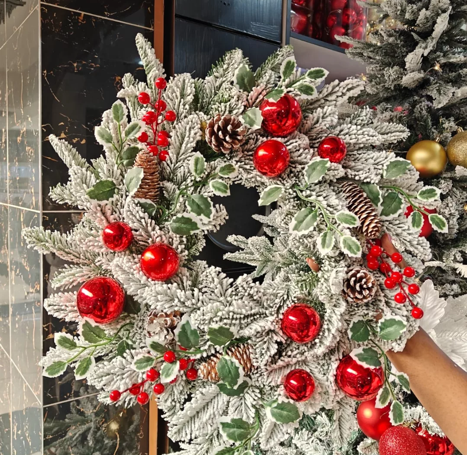 Fully Pre-Decorated: The wreath is thoughtfully adorned with high-quality, contrasting accents, including vibrant red shiny ornaments (baubles), clusters of bright red berries, and natural pine cones.