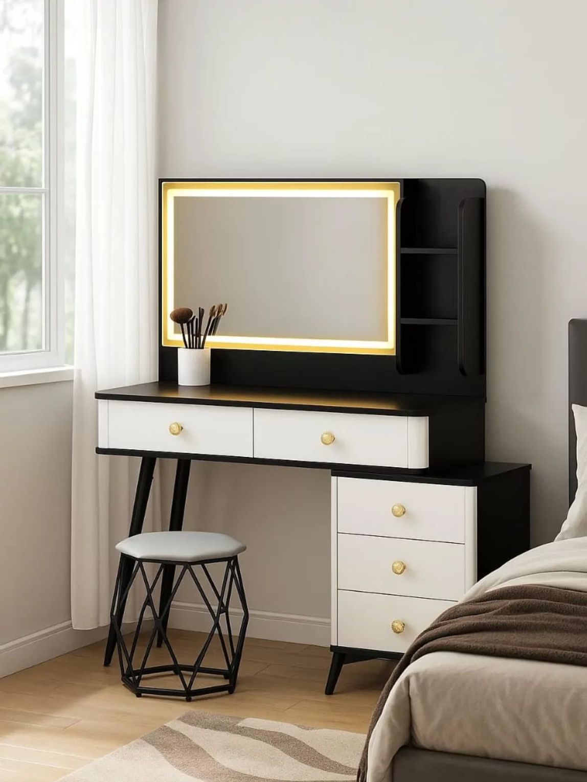 This dressing table is the ultimate combination of stylish modernity and intelligent functionality, making it a spectacular focal point for any bedroom. The striking black and white finish, accented by gold drawer pulls, creates a chic, contemporary aesthetic.