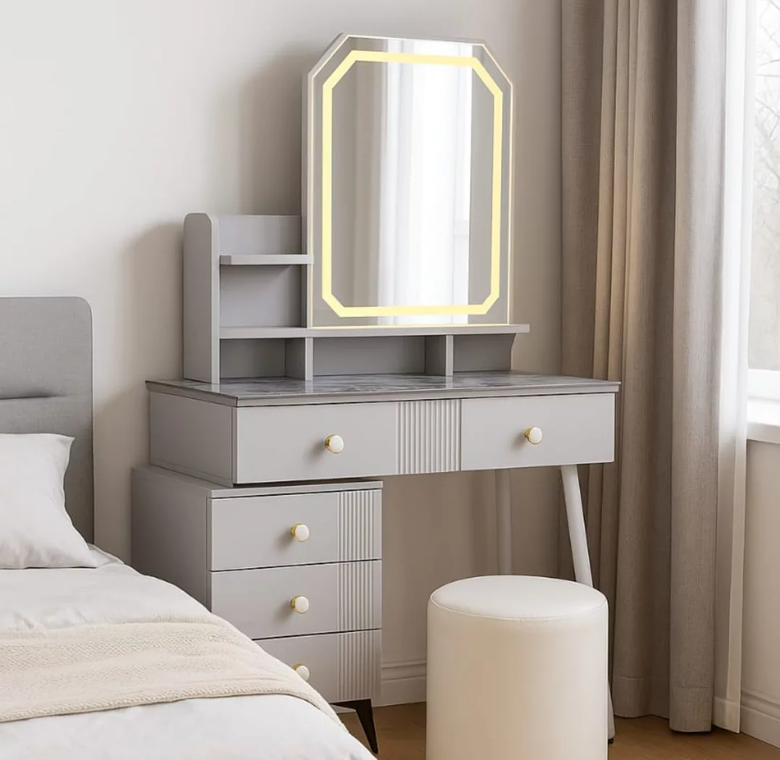 Intelligent Storage: Beyond the main four-drawer chest, the tabletop section includes two additional wide drawers and a shelf unit above the mirror, offering ample, dedicated space for organizing cosmetics, accessories, and décor.
