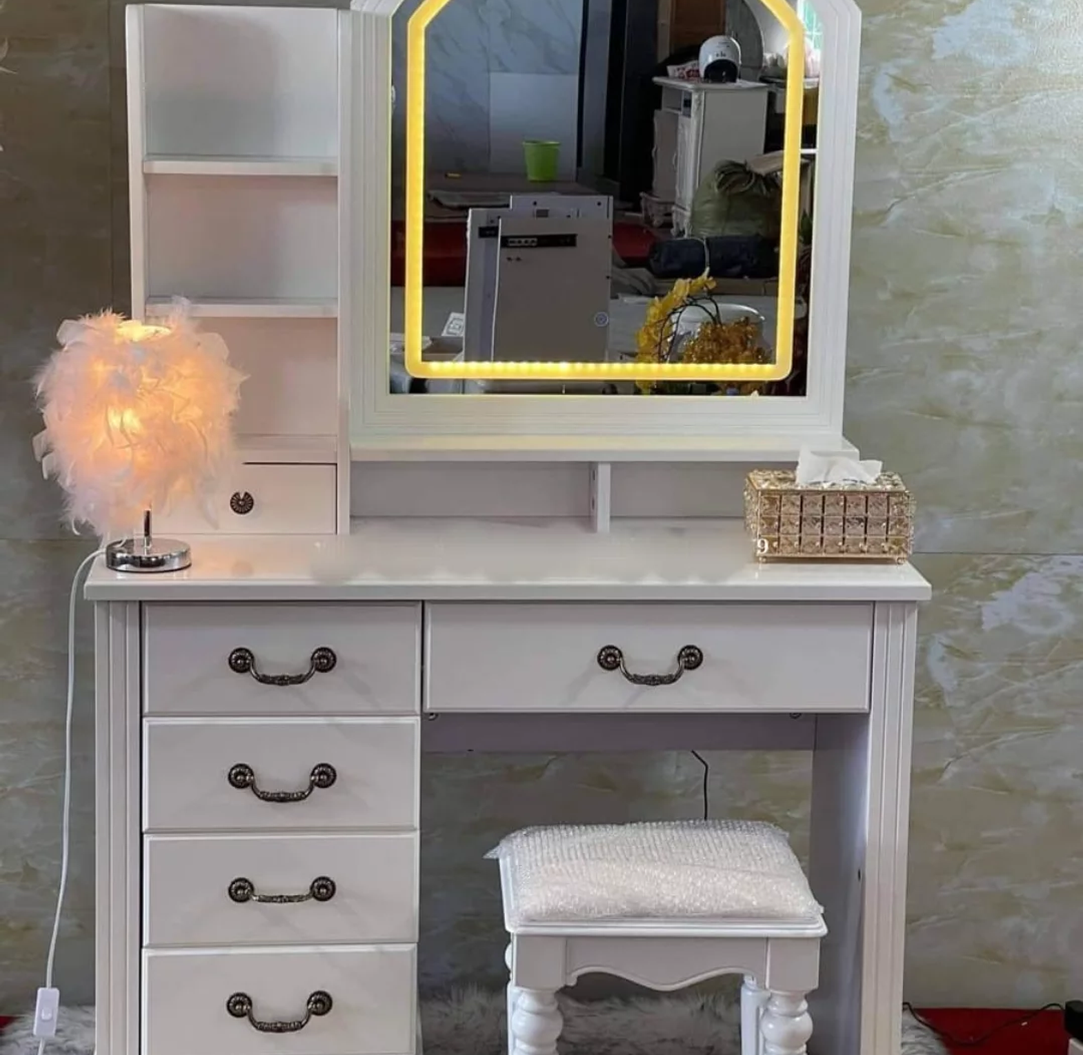 Ample Storage: The desk is designed with exceptional storage capacity, including a total of five drawers (three vertical and two horizontal) and convenient built-in shelving next to the mirror for organizing cosmetics, jewelry, and display items.