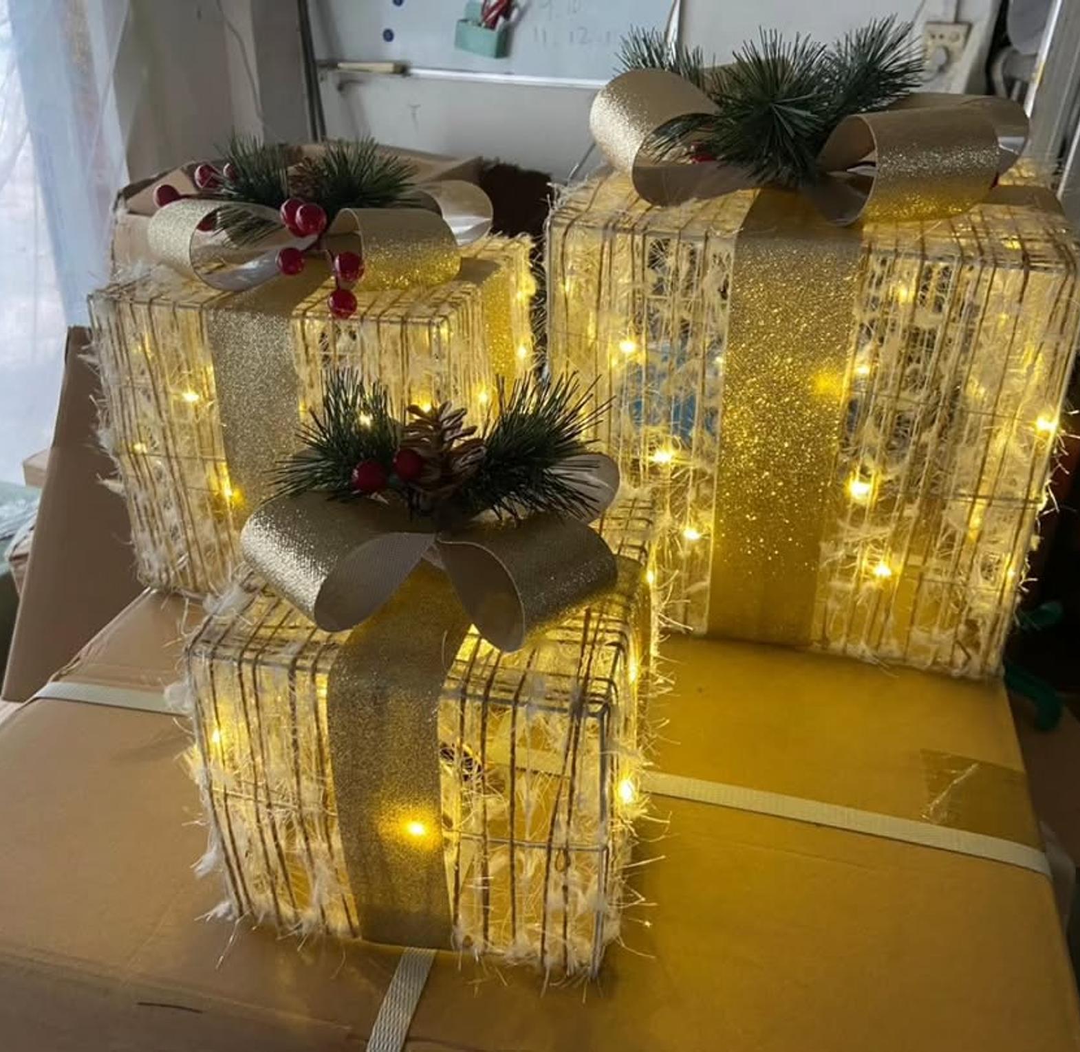 The FrostGlow 3-Piece Snow-Flocked Lighted Gift Box Set adds a luxurious and enchanting touch to your Christmas decorations. Featuring three beautifully crafted boxes in sizes 26x26x19cm, 21x21x19cm, and 16x16x14cm, each piece is adorned with a soft, snow-dusted finish and elegant detailing for a charming winter look. The built-in LED lights emit a cozy, golden glow, making them perfect for placement under the Christmas tree, on the porch, or as part of a festive centerpiece. Designed for both indoor and outdoor use, these durable, easy-to-set-up boxes create a captivating display that enhances your holiday ambiance with warmth and sparkle.