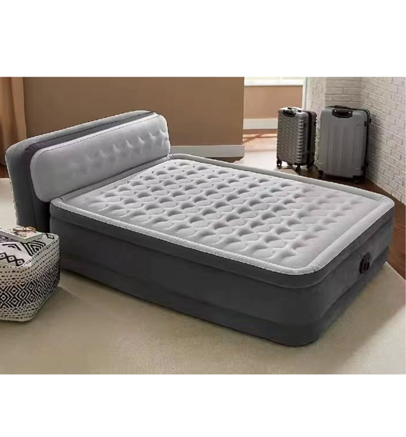 Provide your guests with an exceptional sleep experience using the feature-rich Intex Dura-Beam Queen Air Mattress. This superior airbed boasts a plush, supportive headboard that not only offers comfortable back support for reading but also cleverly prevents pillows from slipping off the back of the mattress. Inflation and deflation are made effortless and fast thanks to the built-in electric pump, which automates the setup and takedown process for maximum convenience. The mattress stands at a comfortable 18-inch height when inflated, mimicking the feel of a traditional bed, and features a velvety soft, flocked surface for a luxurious feel. Inside, the cutting-edge Fiber-Tech technology provides enhanced interior construction for superb stability and lasting support, while the flocked sides are engineered to resist punctures, ensuring reliable, long-lasting use.