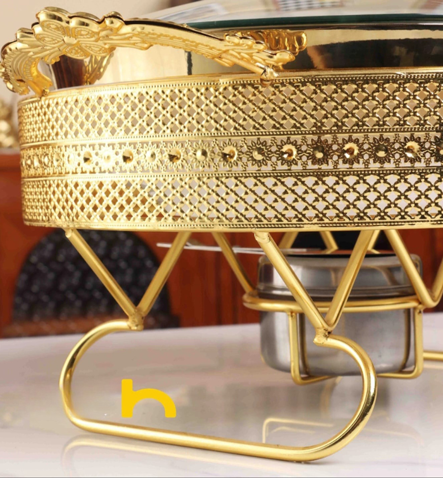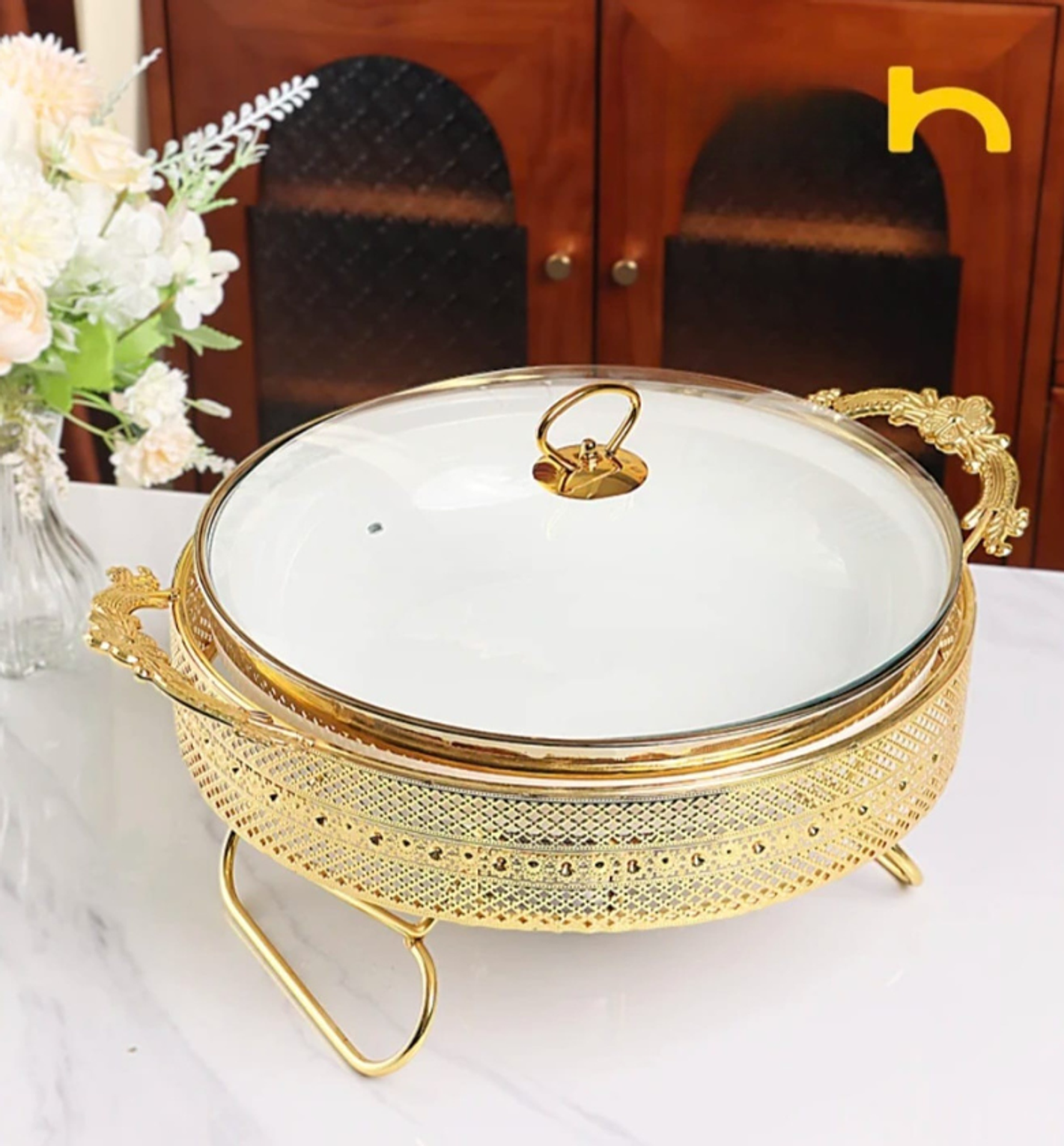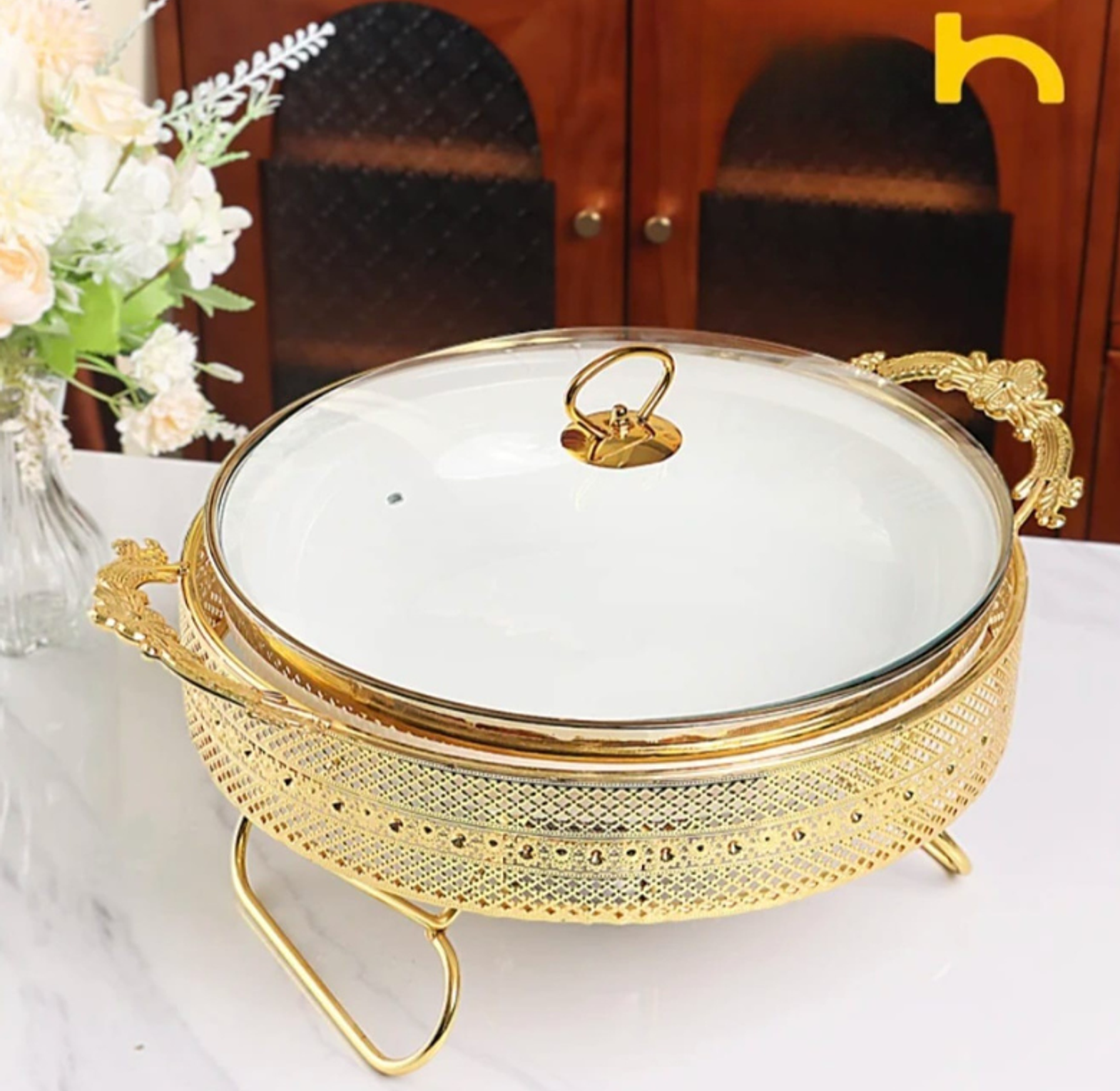 Luxury Design: Featuring ornate handles and a decorative openwork pattern on the gold stand, this piece exudes luxury. The clear glass lid allows for easy viewing of the contents while retaining heat.