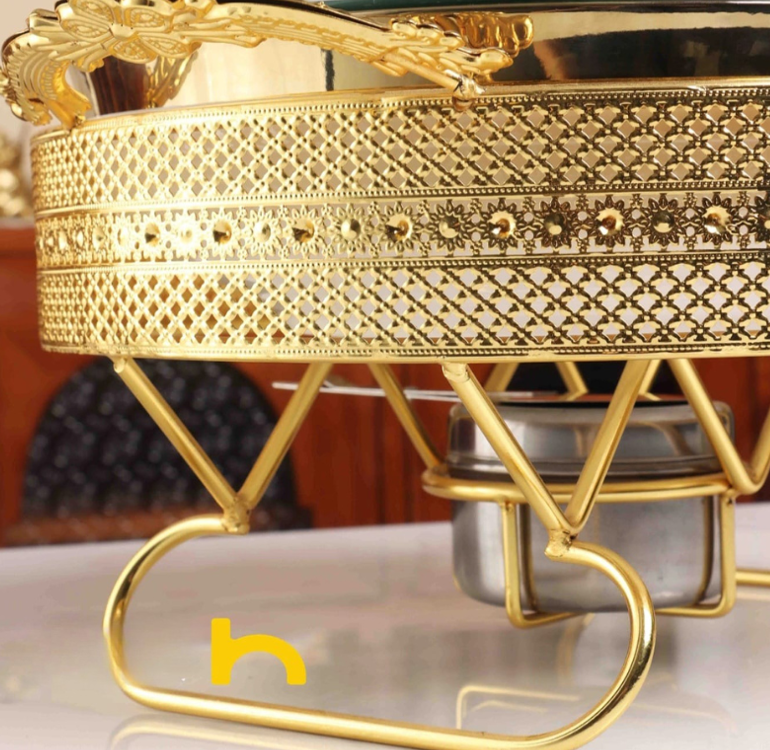 Elevate your hosting and ensure your main dishes are served at the perfect temperature with this elegant and highly functional food warmer. The set includes a pristine white ceramic bowl encased in a decorative gold-finished stainless steel stand, creating a stunning presentation piece for any buffet, party, or dinner table.