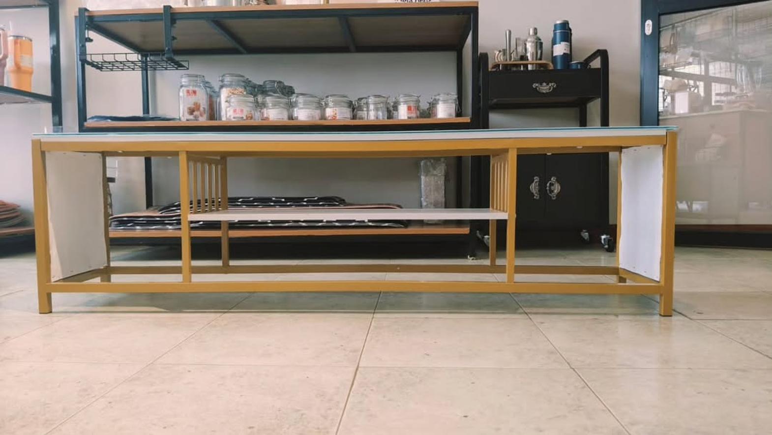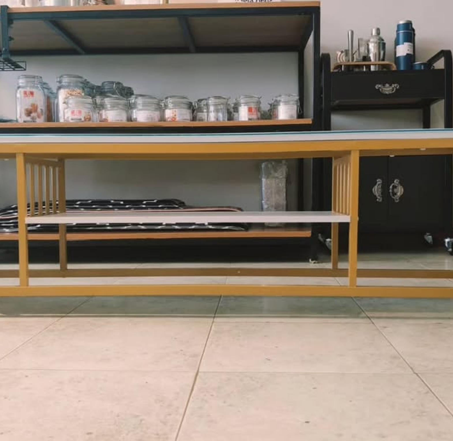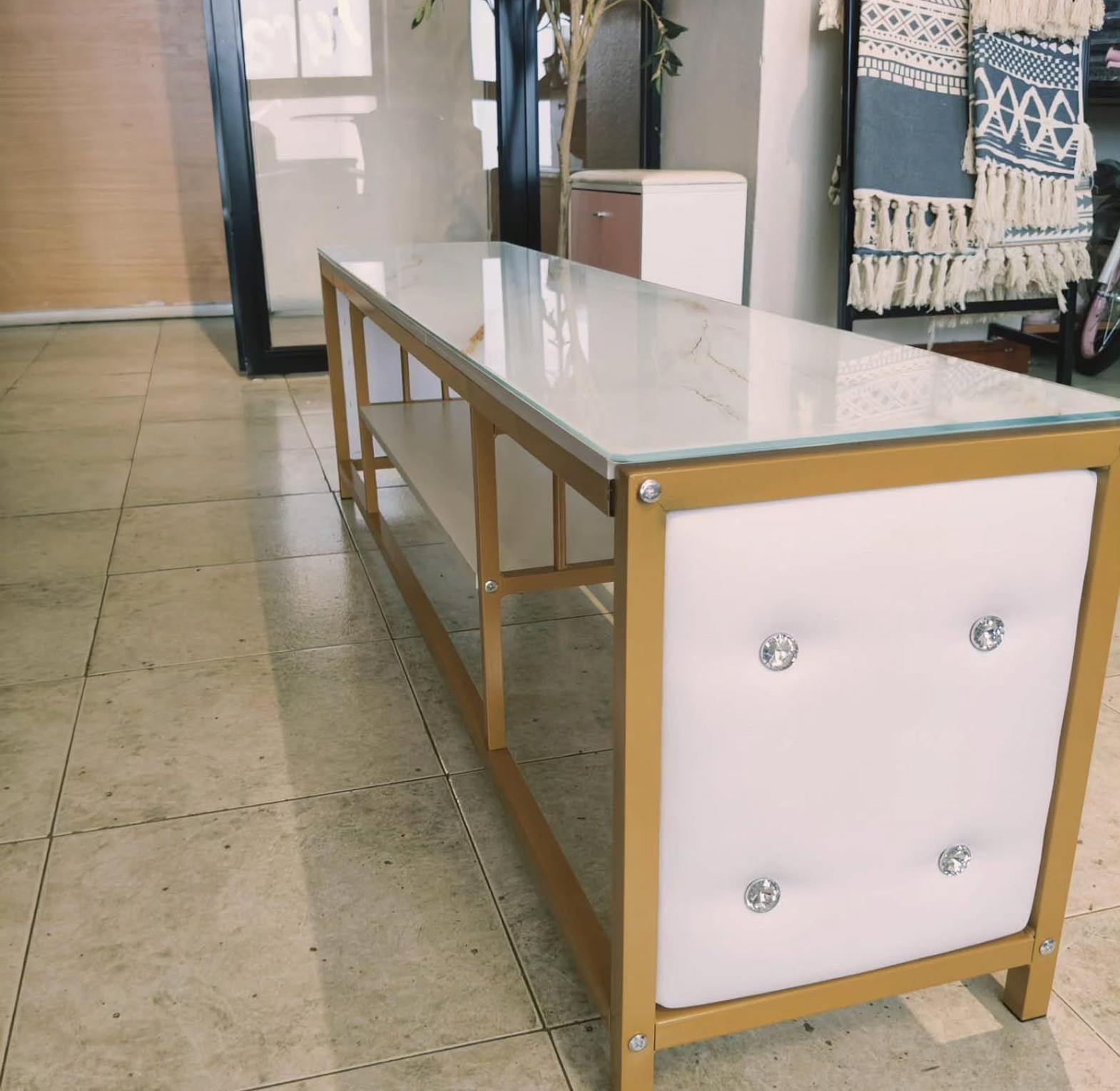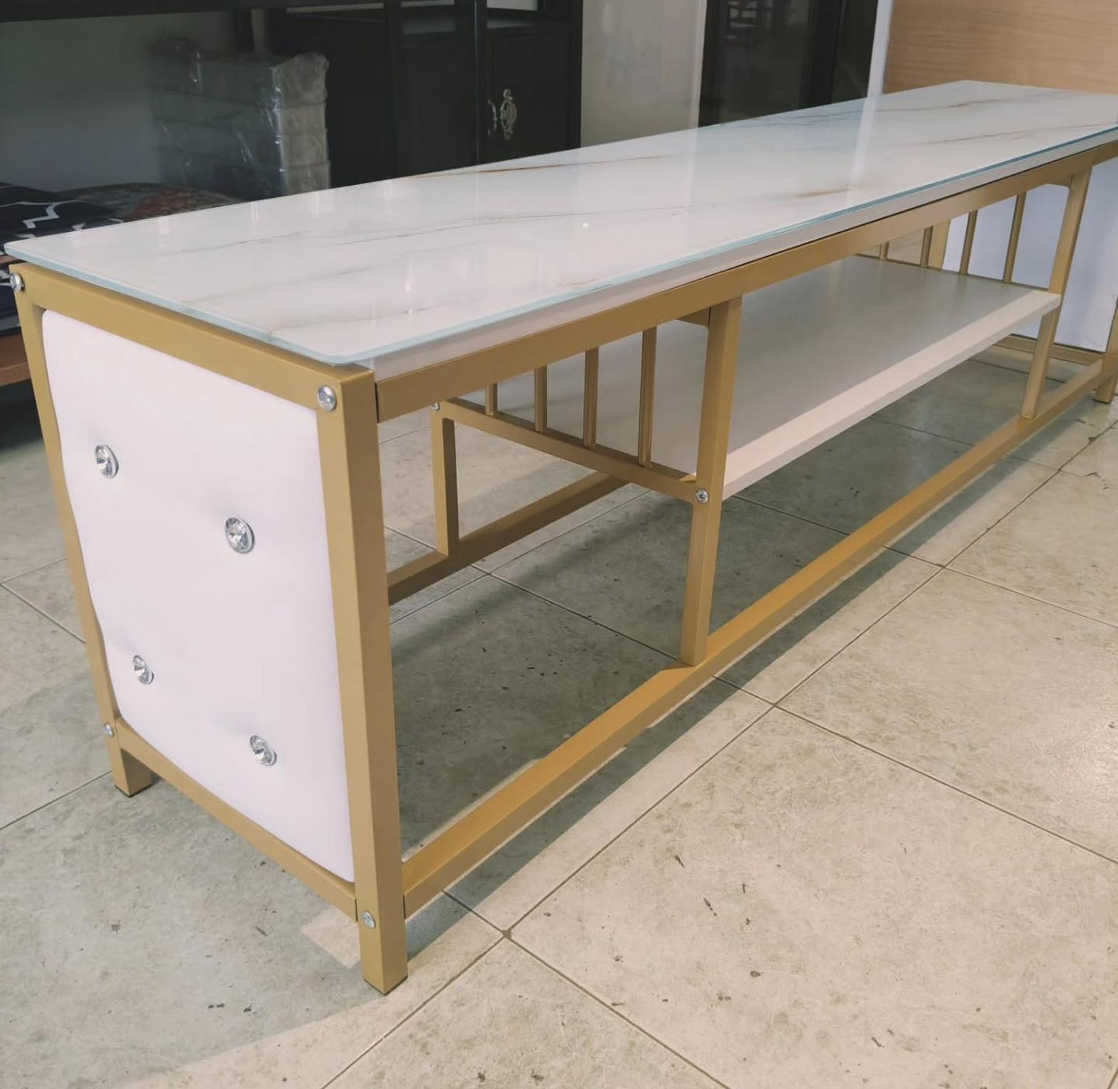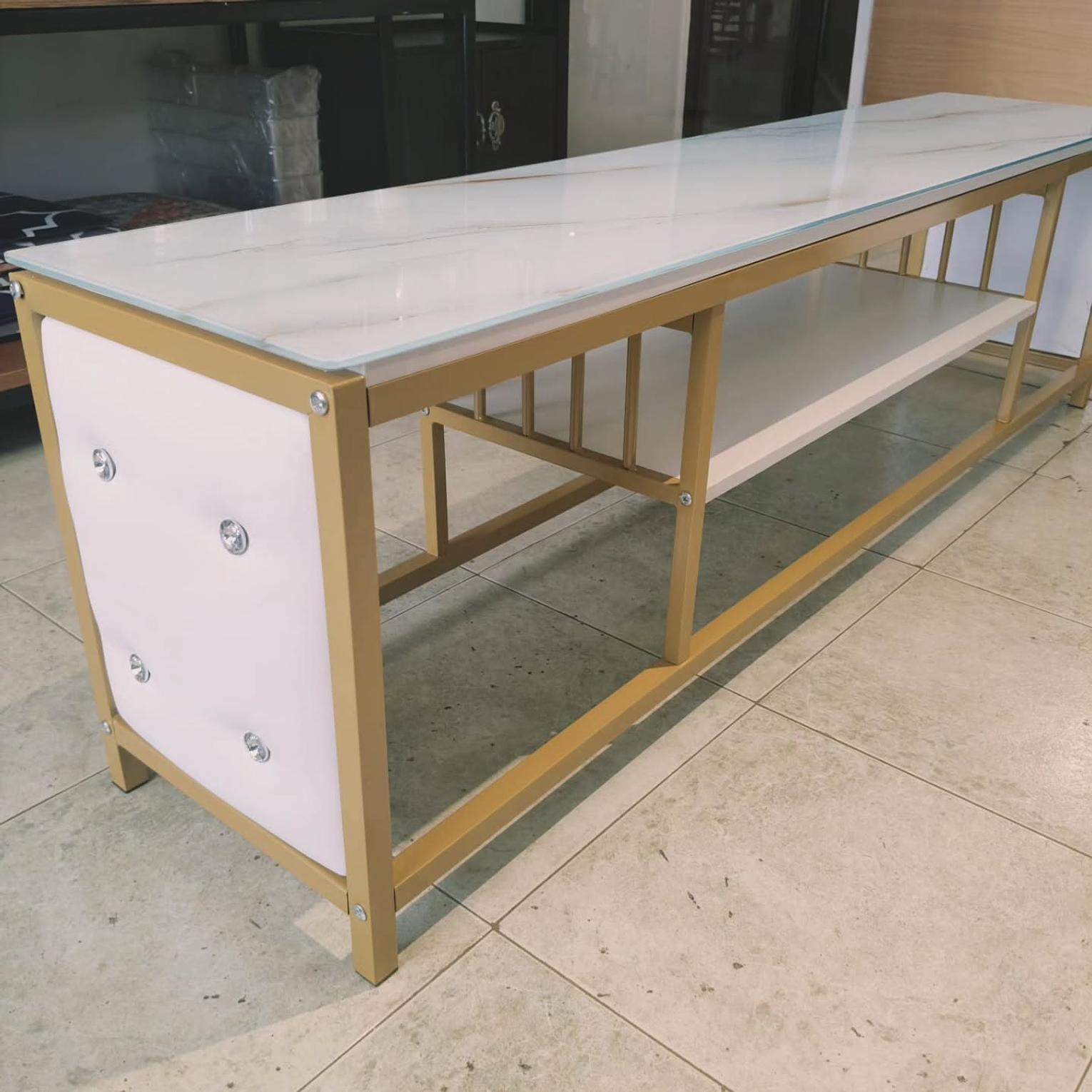 Premium Materials: The stand features a beautiful sleek marble-effect glass top, which is both durable and easy to clean. This top sits securely on a sturdy, metallic frame finished in a striking premium gold color.