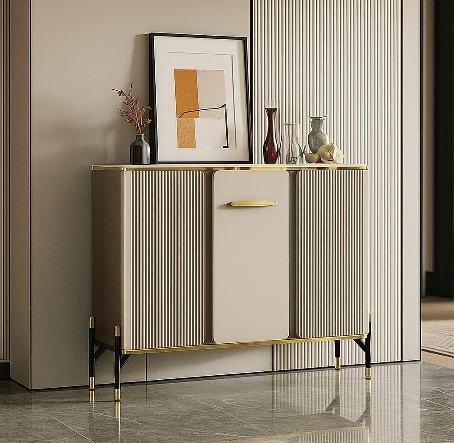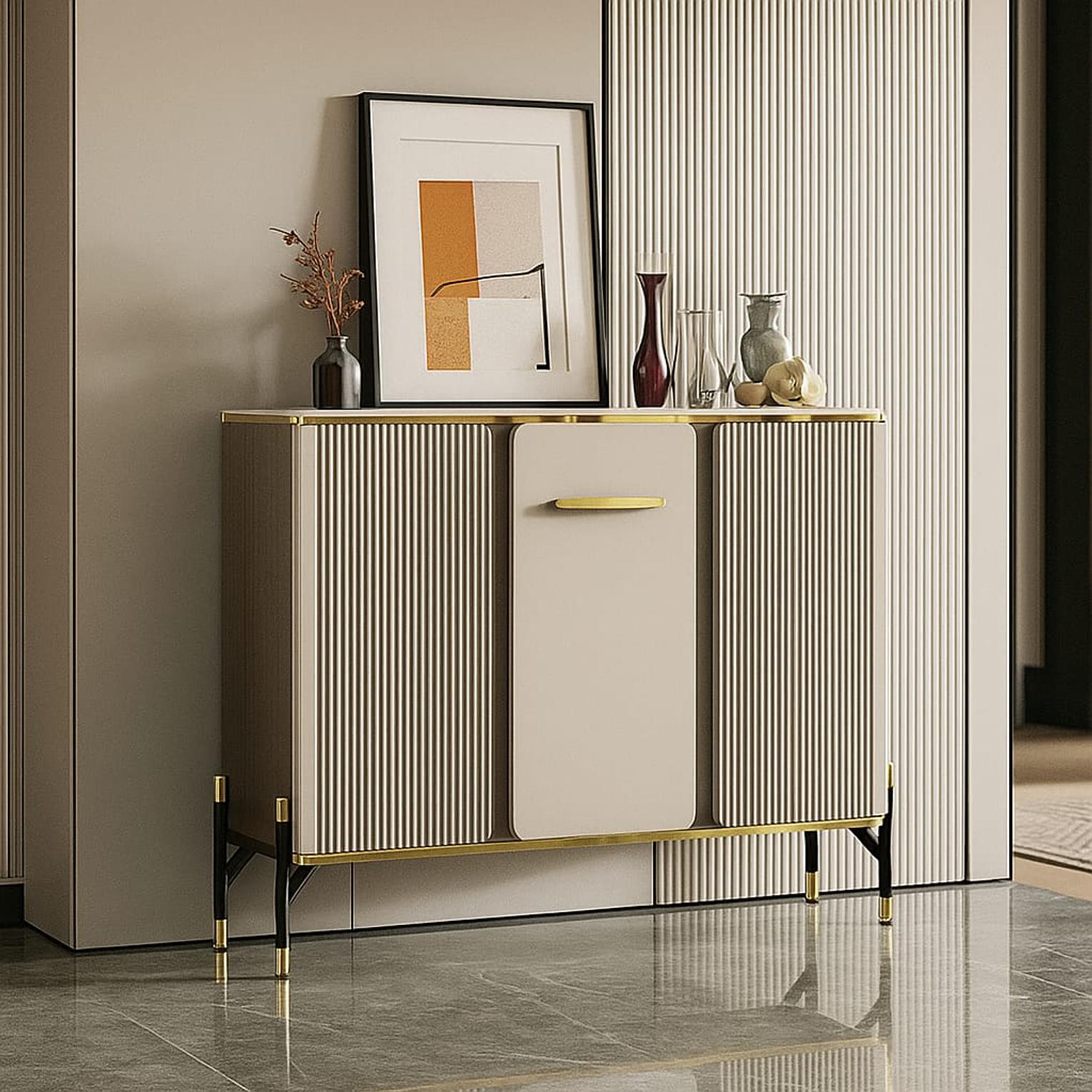 Unique Design: The asymmetrical design with one central solid panel and surrounding fluted panels, along with the distinctive gold hardware and sleek metal legs, creates a luxurious, custom look.