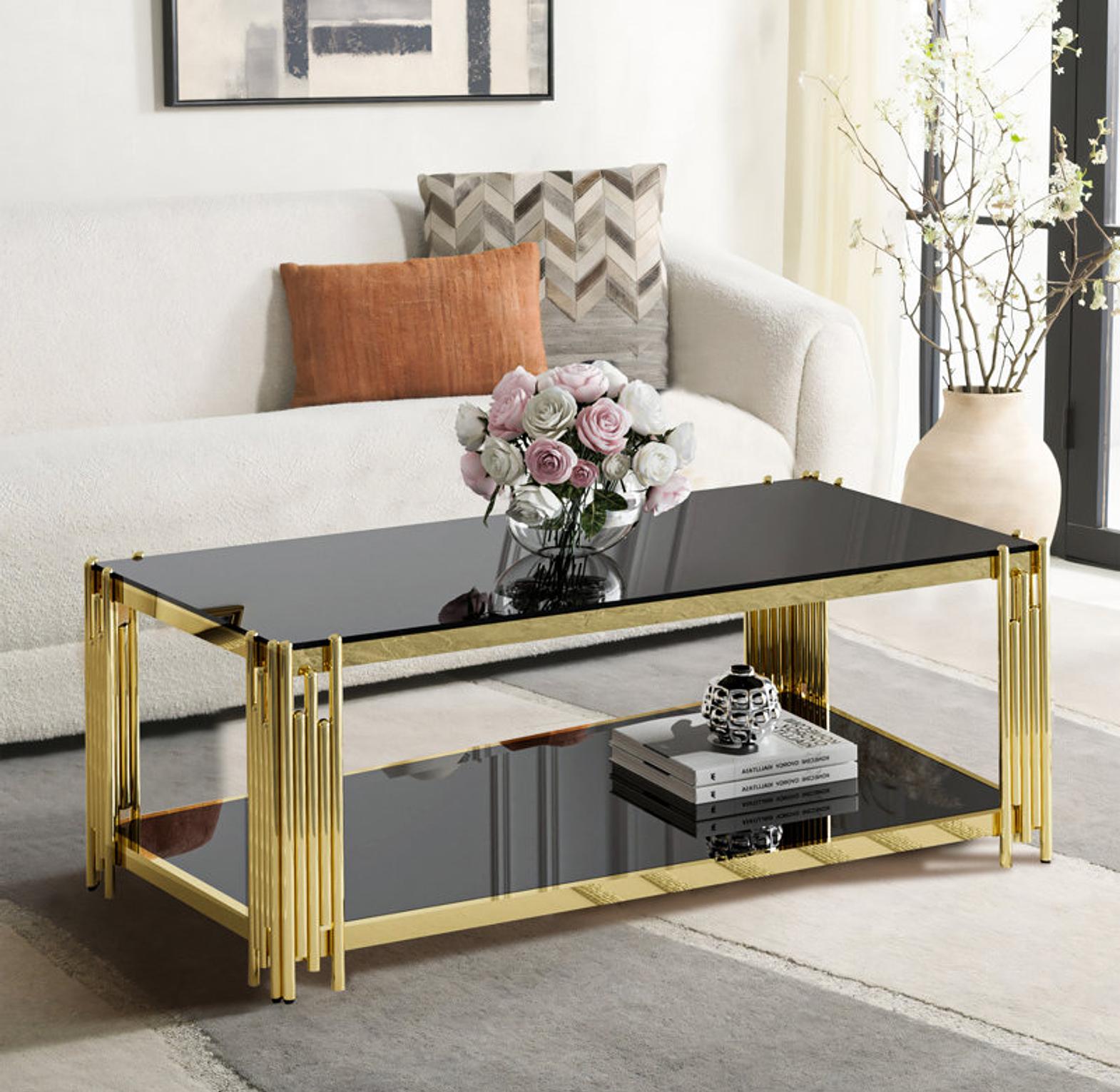 Anchor your living room with this exquisite piece of contemporary furniture, combining structural elegance with practical functionality. The table features a sleek black tampered glass top that is highly durable, easy to clean, and provides a perfect surface for beverages, books, and décor.