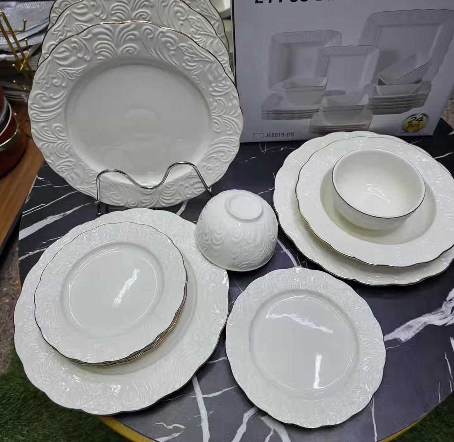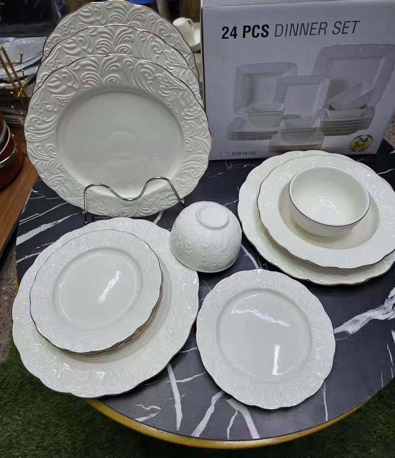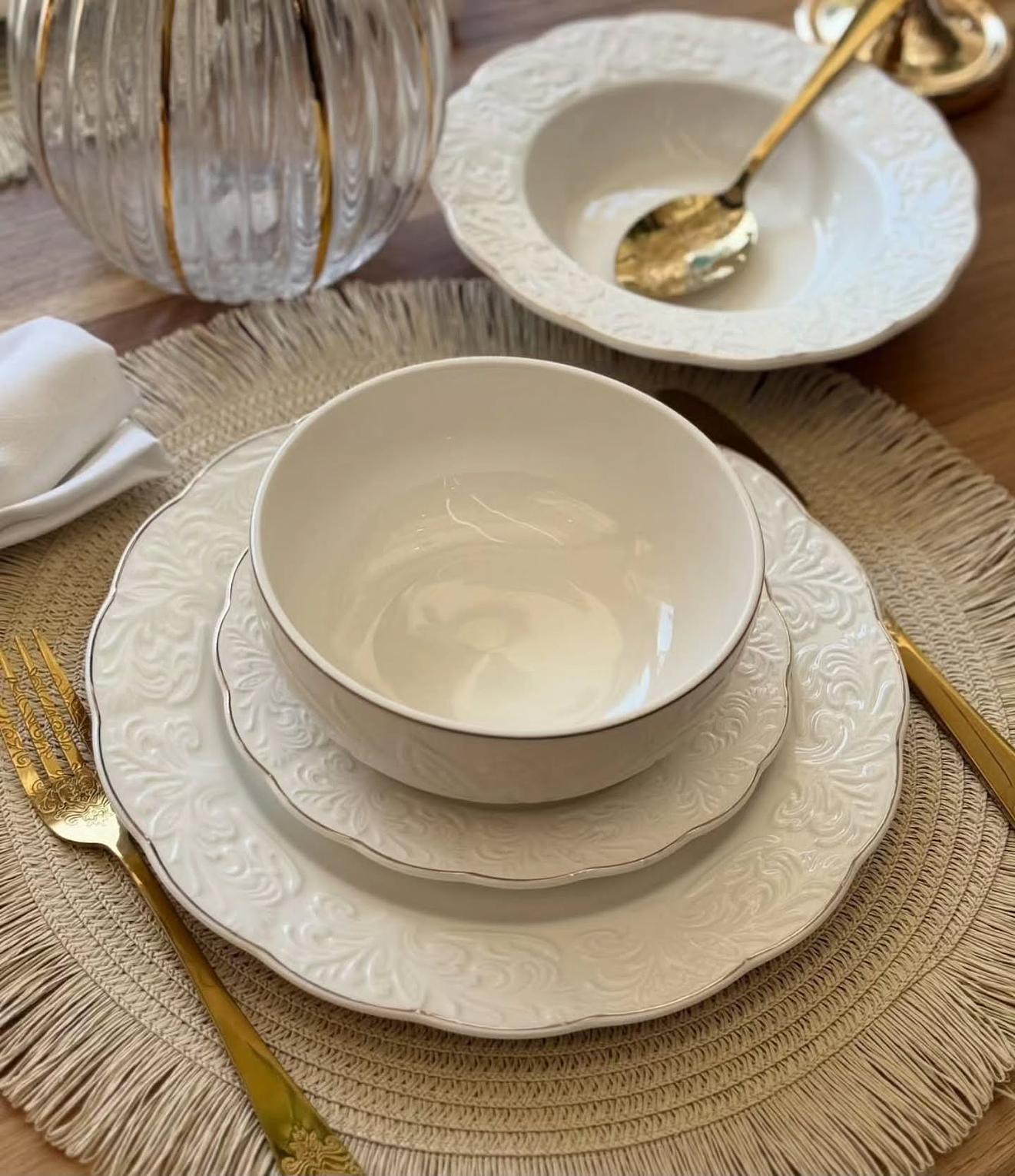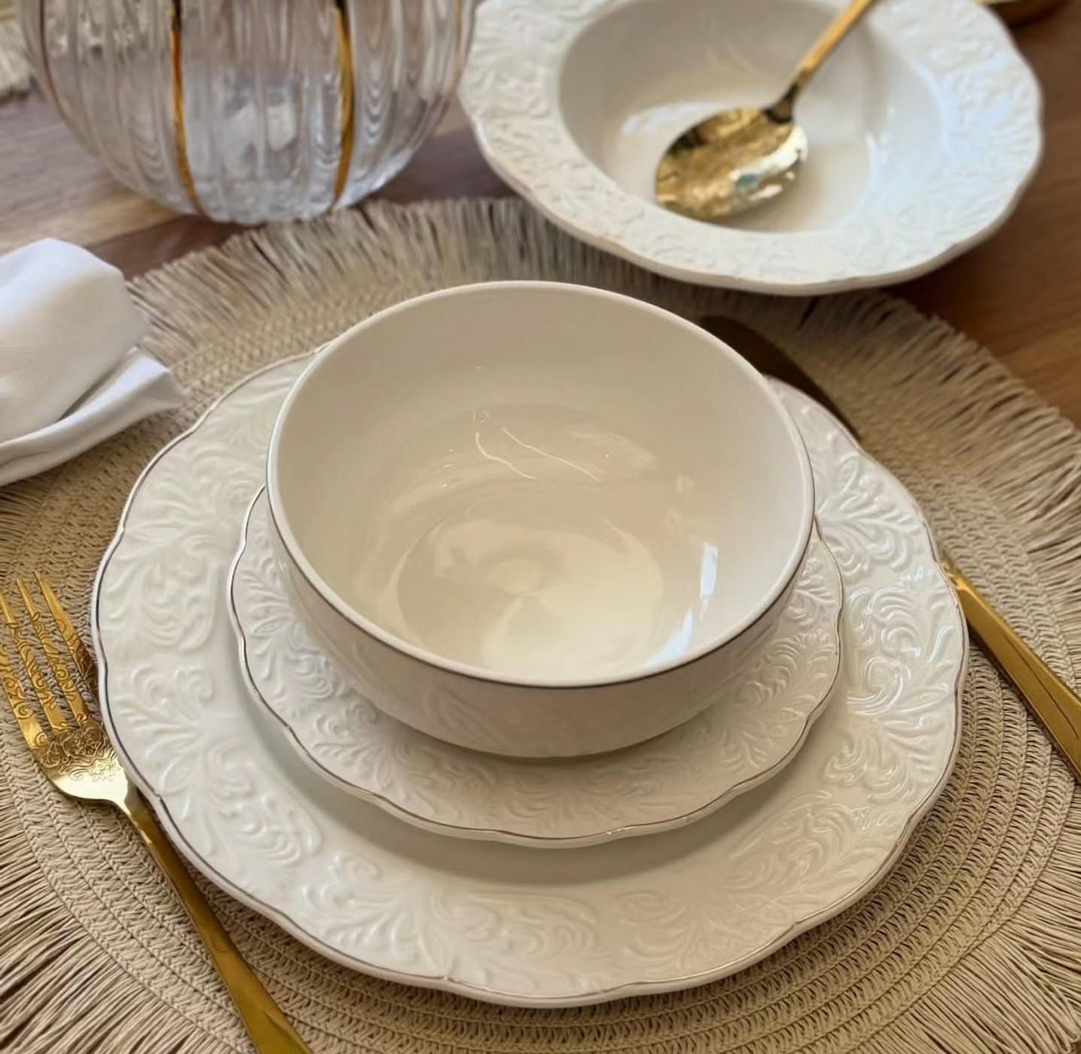Introduce refined luxury to your dining experience with the Nordic Embossed 24-Piece Porcelain Dinner Set. Each piece in this exquisite collection is crafted from high-quality white porcelain, featuring delicate, traditional embossing that provides a rich, tactile surface. A tasteful, slender gold rim encircles the edges, adding a touch of opulent detailing to the overall aesthetic. This comprehensive set is designed to serve six people completely, containing 6 full-sized Dinner Plates, 6 versatile Side Plates, 6 generously deep Salad or Pasta Bowls, and 6 essential Soup Bowls. This elegant dinnerware is styled after classic European designs, making it an ideal choice for formal gatherings, holiday feasts, or simply transforming a standard family dinner into a distinguished occasion. The durable finish ensures these pieces remain cherished components of your home for years to come.