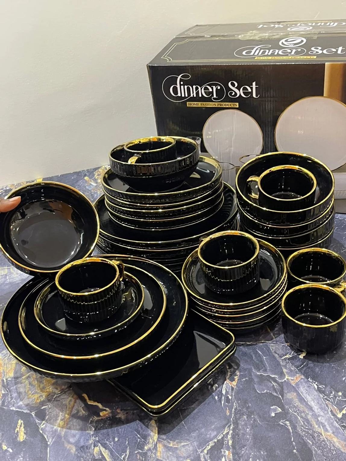 The Onyx & Gold Signature Dining Collection is a visually stunning 32-piece set that offers a contemporary and sophisticated table presentation. This comprehensive collection provides a full service for six people, including six main plates, six side plates, six versatile bowls, and six matching cups with six saucers. The dramatic black background of the ceramic pieces is elegantly finished with a radiant gold rim, creating a high-contrast and luxurious effect. Completing the set are two large platters for serving appetizers or main courses. This durable and fashionable dinnerware is an excellent choice for homeowners looking to introduce a touch of dramatic modern elegance to their entertaining spaces.