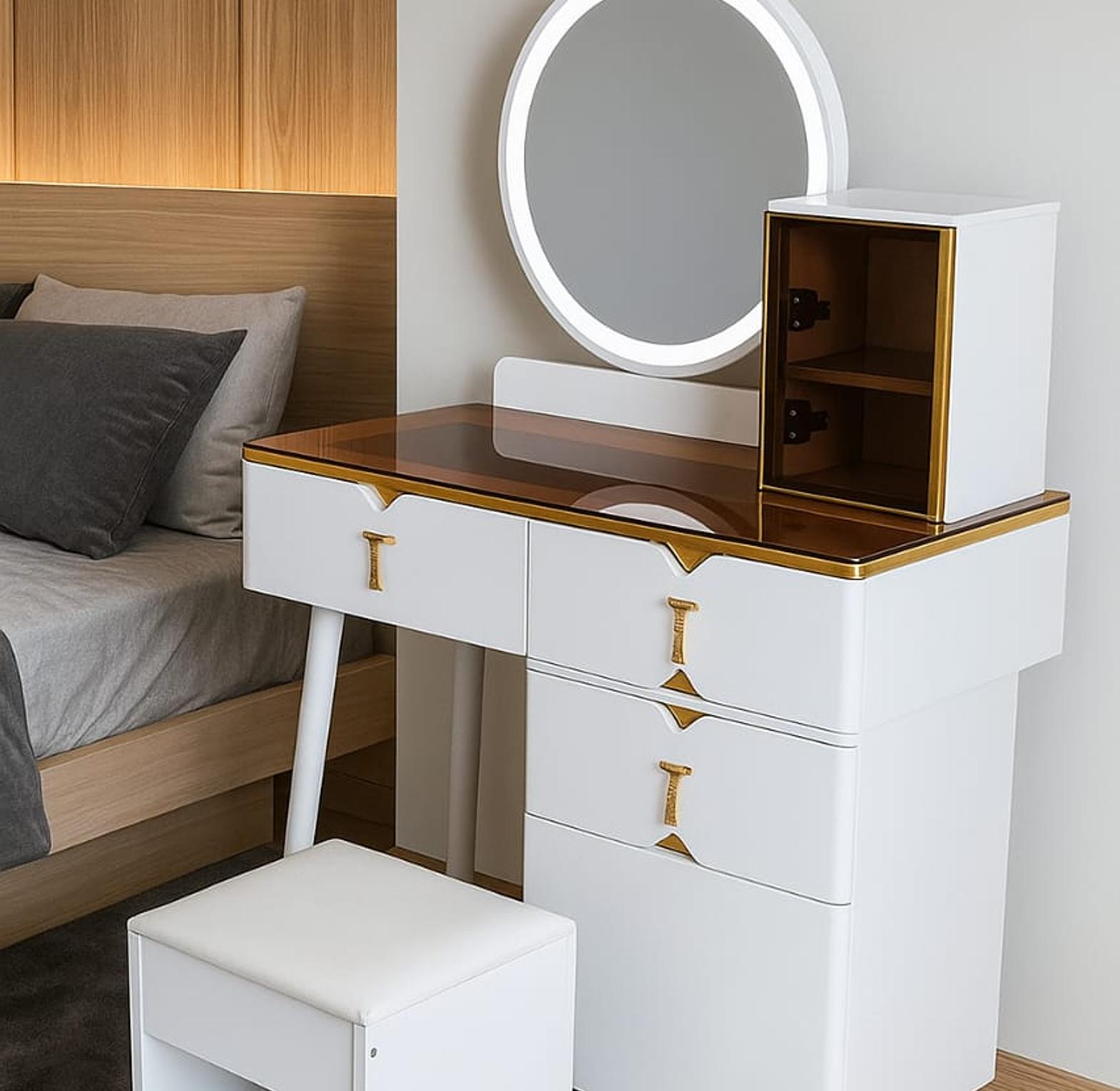 This vanity desk is the perfect statement piece, combining clean, modern design with luxurious gold accents and highly practical features. The main storage unit is retractable, allowing you to adjust the width (W80cm) and configuration to best fit your bedroom layout.