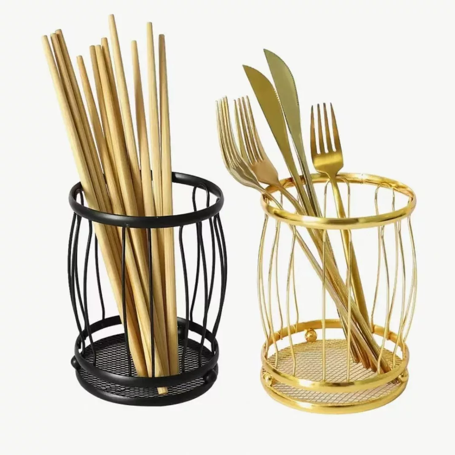 Keep your kitchen drawers clutter-free and your essential tools within easy reach with this highly functional metal cutlery holder. Constructed from a strong and durable metal with a stylish aged finish, this organizer is built for longevity in busy environments. Its spacious cylindrical design is ideal for holding a variety of items, including cooking spoons, forks, knives, and a range of other common kitchen tools. The key feature is the open, airy design combined with a sturdy mesh base, which facilitates quick drying of freshly washed utensils and allows for easy cleaning. This versatile and attractive piece is perfect for enhancing organization and aesthetics in the home, as well as in professional settings like hotels or restaurants.