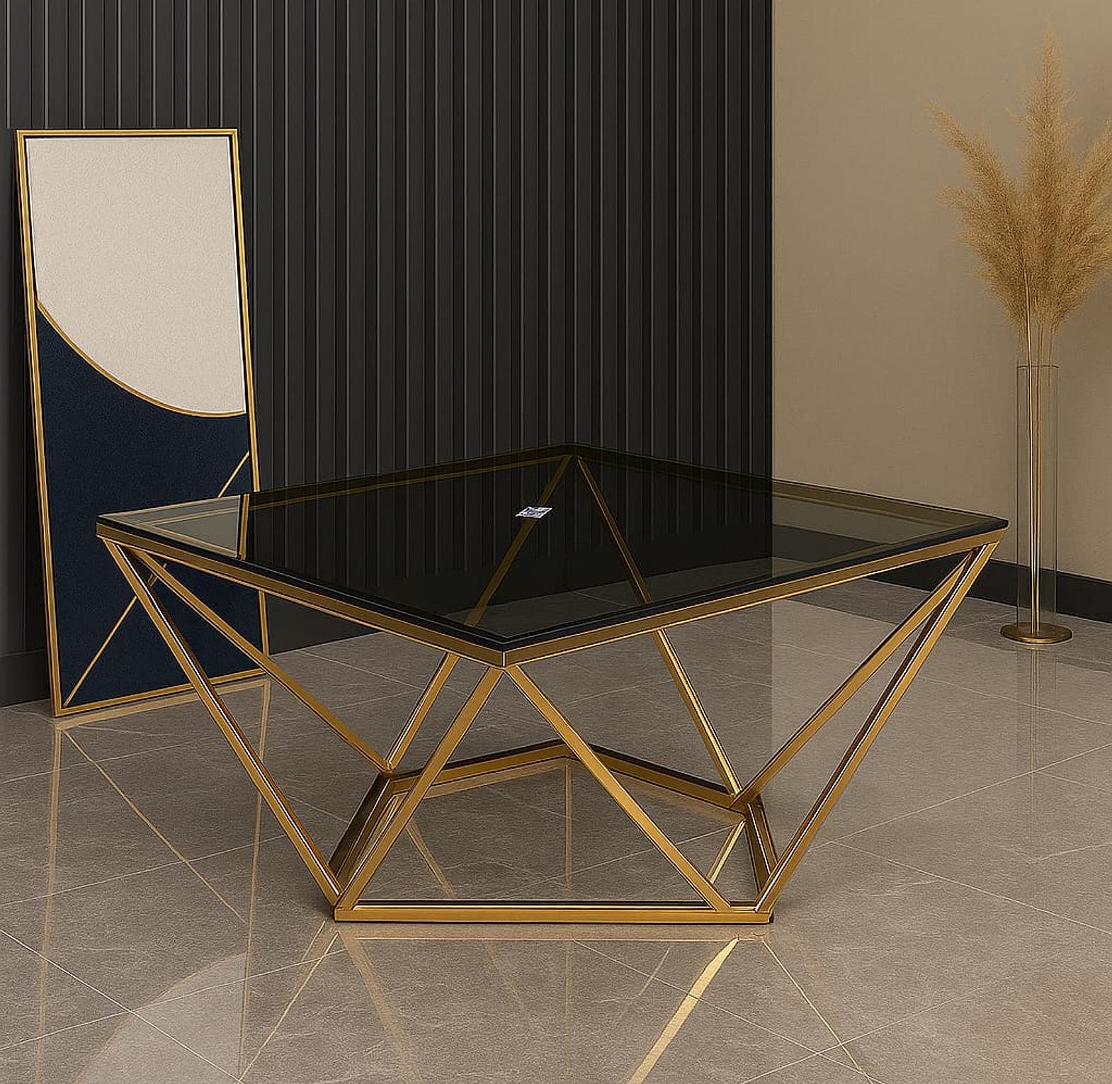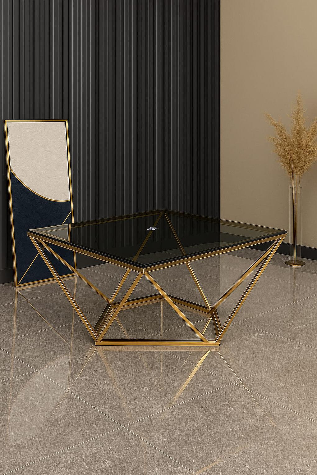 Anchor your contemporary living space with this striking and sculptural coffee table. The design is a masterpiece of modern geometry, featuring a base constructed from high-quality stainless steel finished in a radiant gold color. This framework is shaped into a dynamic, diamond-like structure, ensuring the table is not just furniture, but a work of art.