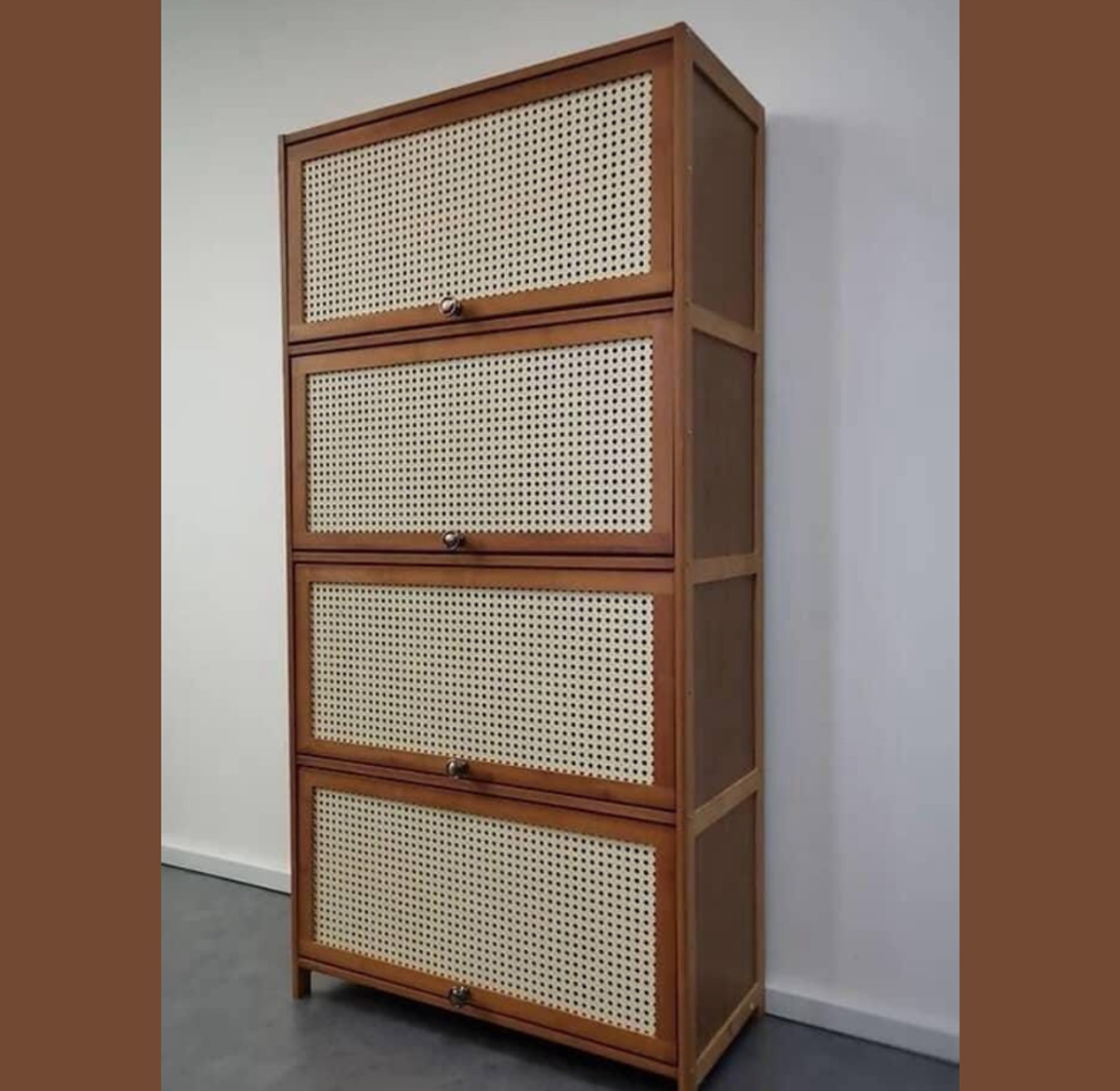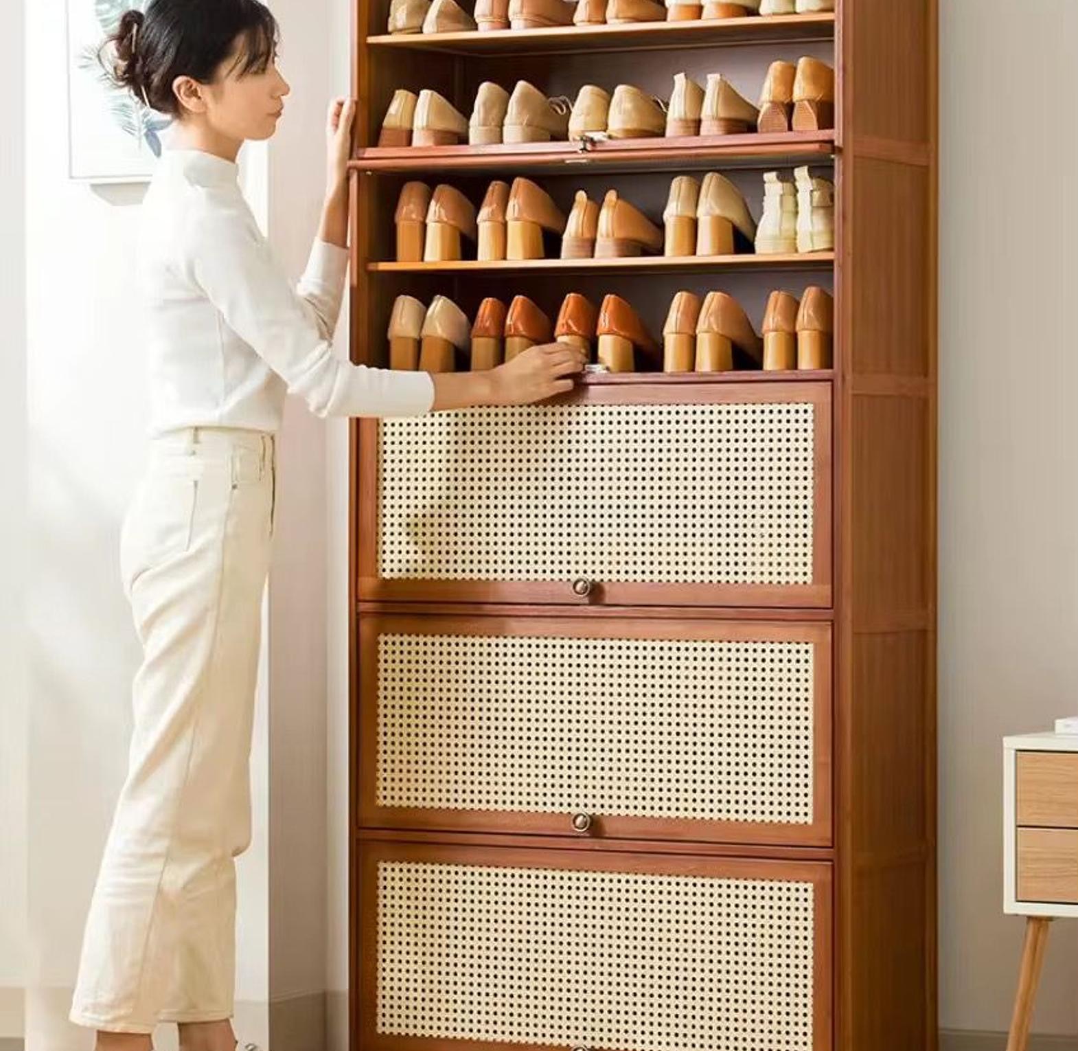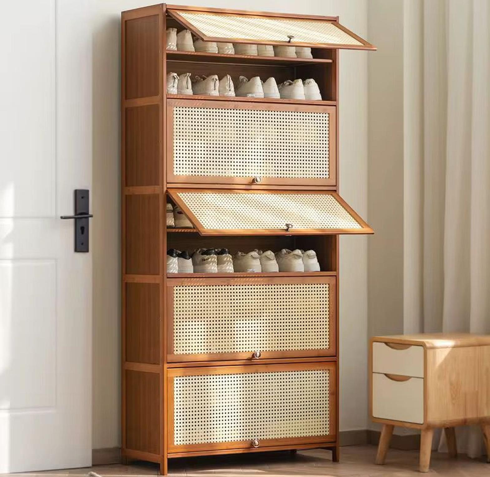 Say goodbye to clutter with this highly functional and elegant bamboo storage cabinet, a must-have for homes with extensive shoe collections. This piece merges a modern aesthetic with rugged utility, providing vertical storage that utilizes space efficiently.