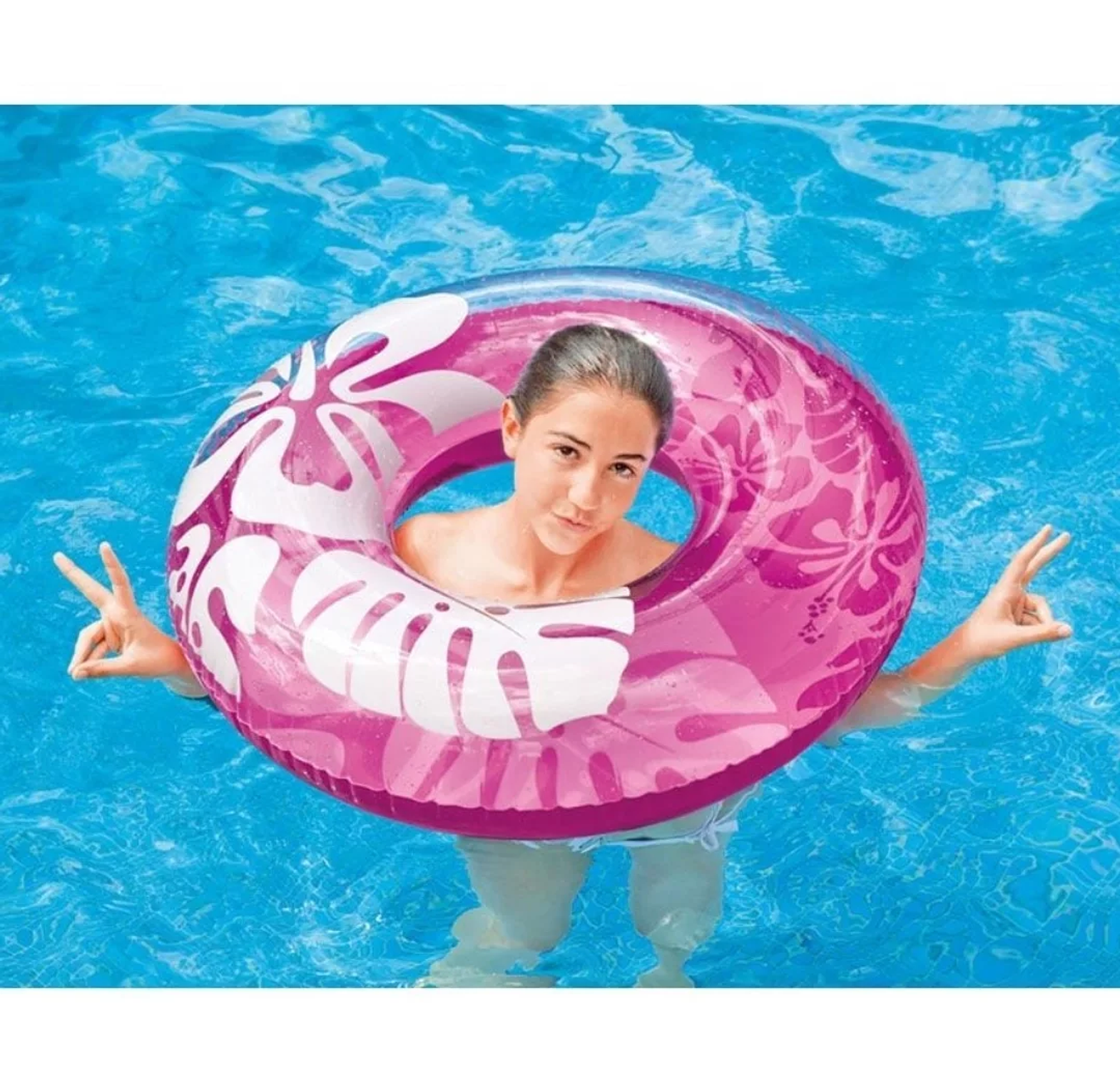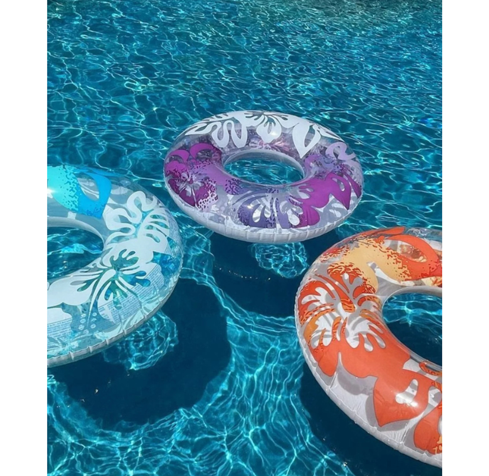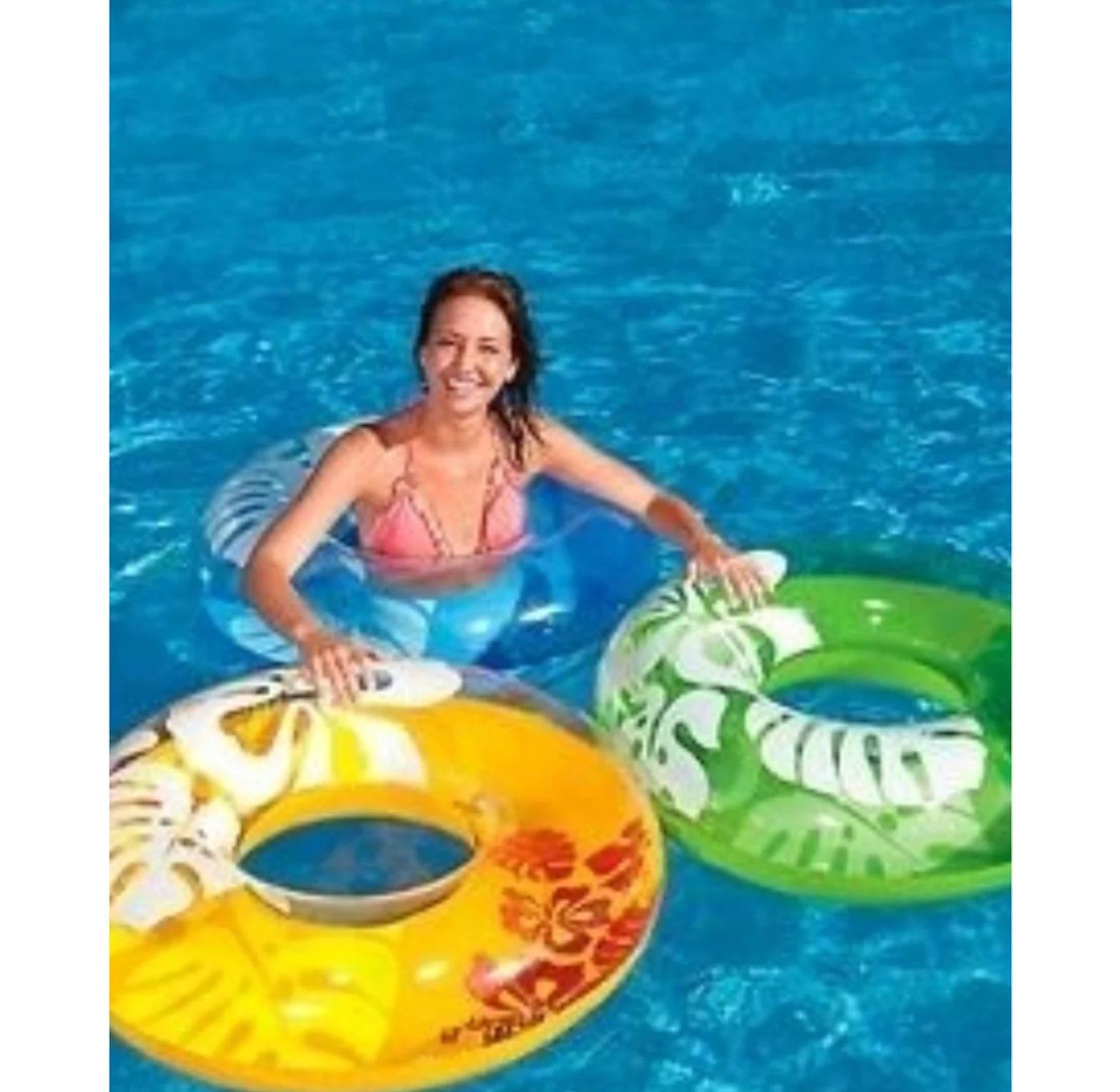 The Tropical Print Inflatable Swim Ring Floats are the ultimate accessory for stylish relaxation during your water activities. This eye-catching set includes three large rings, each sporting a distinct, vivid color scheme (purple, blue, and orange) overlaid with a breezy tropical leaf pattern set against a clear background. Made from high-quality, durable vinyl, these floats offer robust support for both adults and older children while ensuring long-lasting fun throughout the summer season. The spacious inner diameter allows for comfortable lounging and floating. Easily inflatable and deflatable for quick setup and compact storage, this trio is essential for bringing a vibrant, island-inspired aesthetic to your swimming pool, lake outing, or vacation resort.
